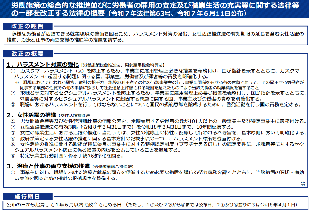 労働施策の総合的な推進並びに労働者の雇用の安定及び職業生活の充実等に関する法律等の一部を改正する法律が令和7年6月11日に公布されました。