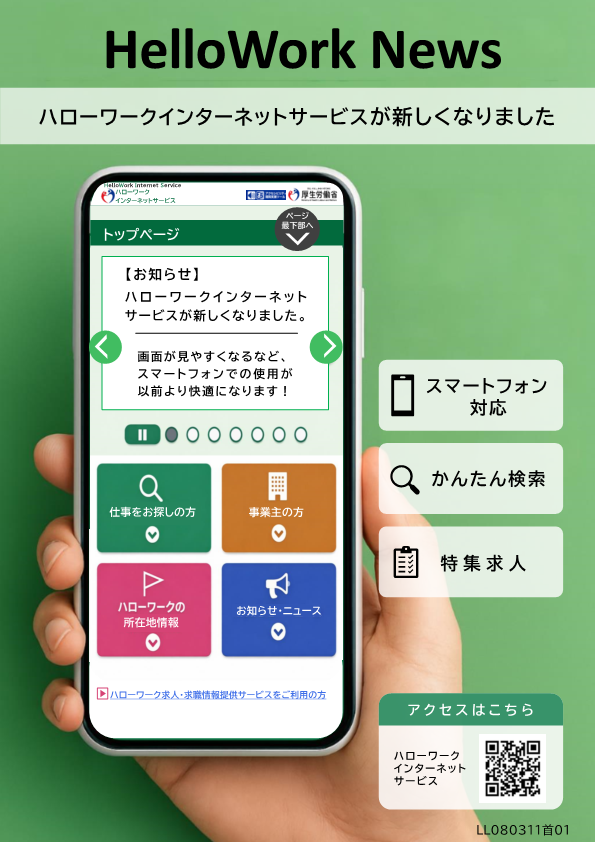 ハローワークインターネットサービスとは、お持ちのパソコンやスマートフォン等で全国のハローワークの求人(年間新規求人数は約1,000万人以上)を検索することができるオンラインサービスです。 3月23日(月)よりスマートフォンでの視認性を改善し、「かんたん検索」や「特集求人」の新設により検索の利便性が向上します。 (※)ハローワークインターネットサービスの月間アクセス件数:約8,500万件