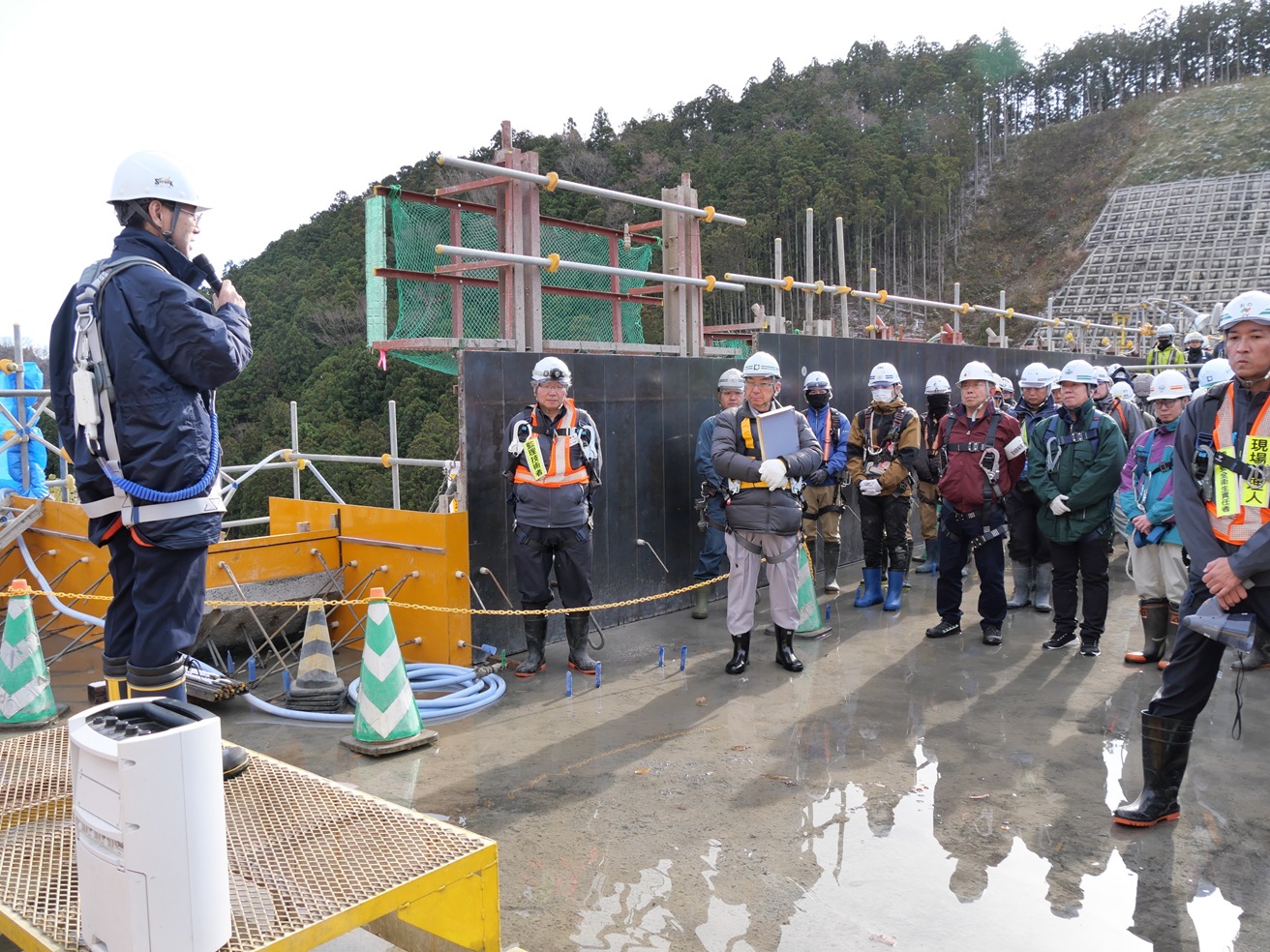 当日の朝は雪が舞い、路面もうっすらと白くなるほど気温が下がりましたが、天候に左右されやすい建設工事における墜落・重機・崩壊災害などの対策について現場を点検しました。
