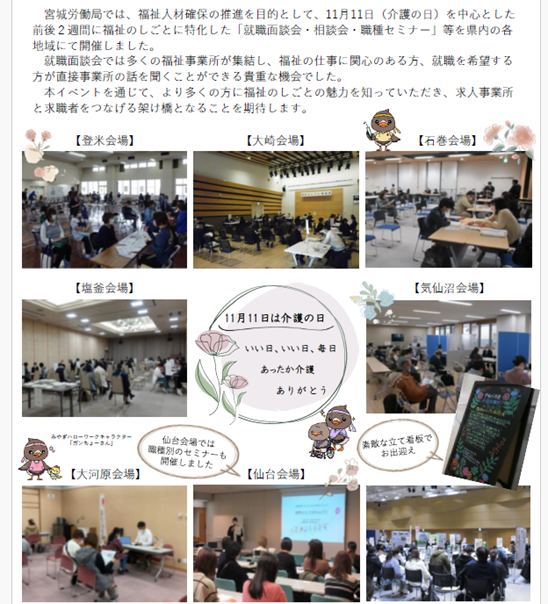 宮城労働局では、福祉人材確保の推進を目的として、11月11日(介護の日)を中心とした 前後2週間に福祉のしごとに特化した「就職面談会・相談会・職種セミナー」等を県内の各 地域にて開催しました。 就職面談会では多くの福祉事業所が集結し、福祉の仕事に関心のある方、就職を希望する 方が直接事業所の話を聞くことができる貴重な機会でした。 本イベントを通じて、より多くの方に福祉のしごとの魅力を知っていただき、求人事業所 と求職者をつなげる架け橋となることを期待します。