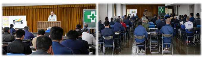キャンペーンでは、市場内の卸売業者・仲卸業者約40社を巡回し、荷主等(発・着荷主)の陸上貨物運送事業における労働災害防止への協力を呼び掛けました。その後、仙台市経済局中央卸売市場との共催による労災防止研修会を開催し、当局担当官から、市場内での荷役作業時の安全対策を説明したほか、長時間の荷待ち時間の解消の協力要請を行いました。研修会には市場内の卸売業・仲卸業に従事する安全担当者約40名が参加しました。