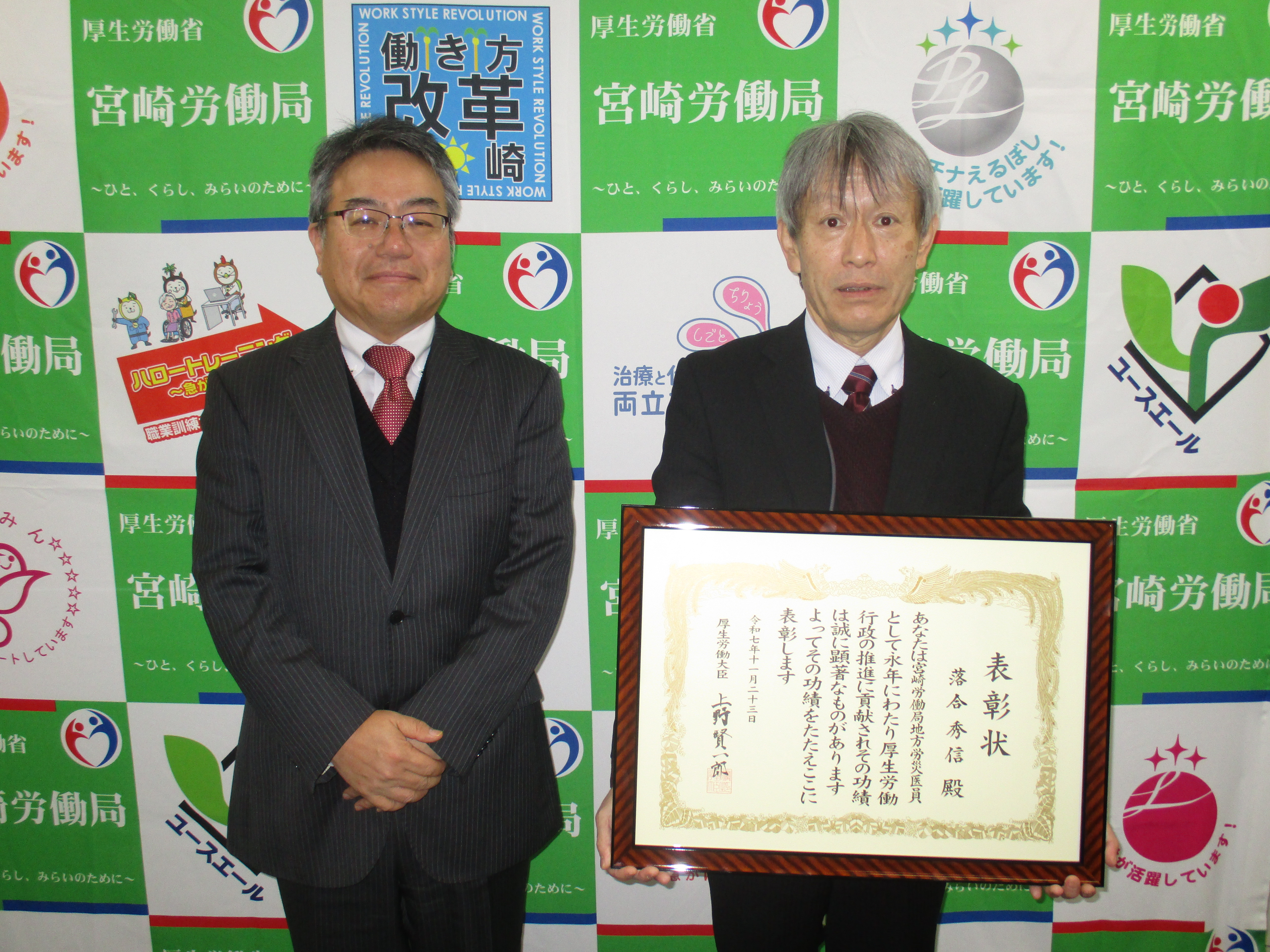 宮崎労働局(局長 吉越 正幸)は、令和7年12月24日、同局地方労災医員に対して、厚生労働大臣表彰状を伝達授与しました。