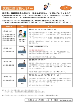 会場:ハローワーク日向 2階会議室日時:1月27日(火) 13:30~15:30※参加無料、服装自由、事前予約可(来所のほか、電話、オンラインでも予約可能です。)