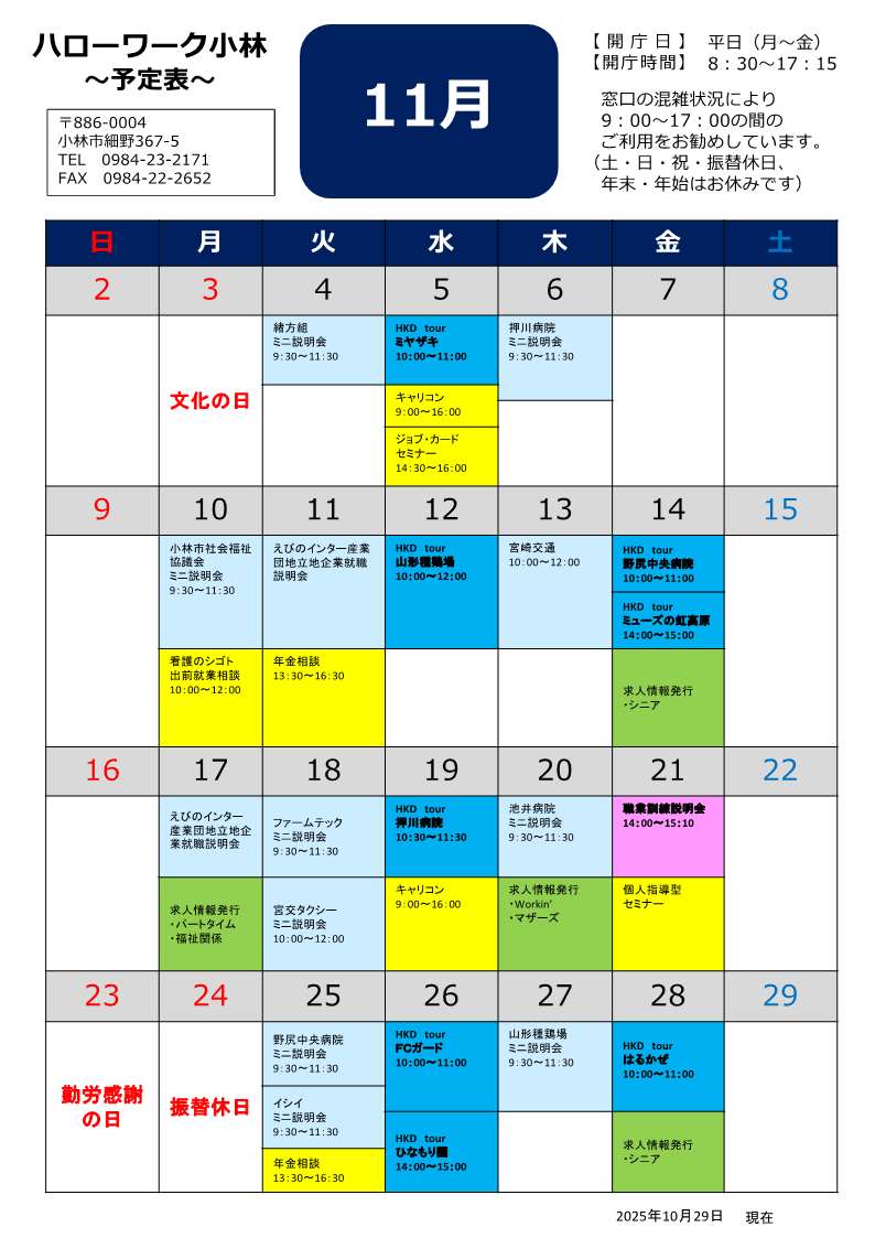 各月ごとのハローワーク小林の予定表です。イベント・セミナー等の日程を掲載しています。なお、予定は変更となる場合がありますのであらかじめご了承ください。