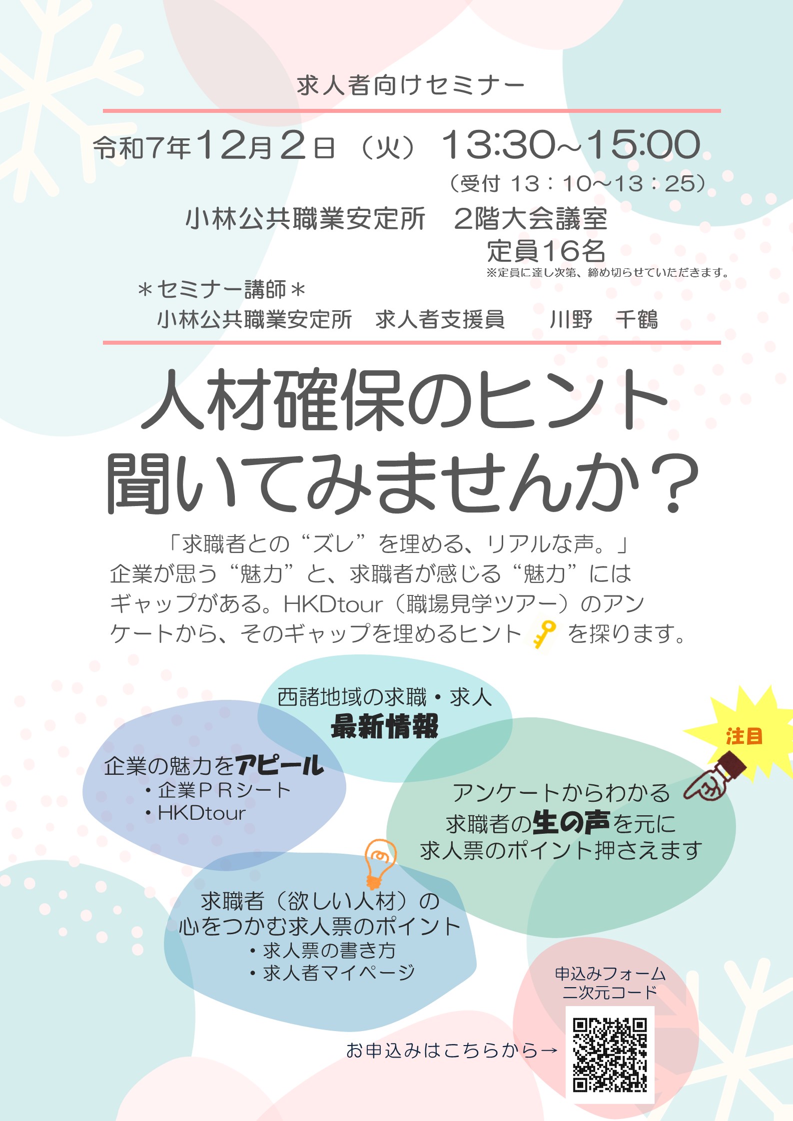 ハローワーク小林では、就職説明会やセミナーなど定期的に開催しております。全て無料で参加できます。ぜひ、ご参加ください。