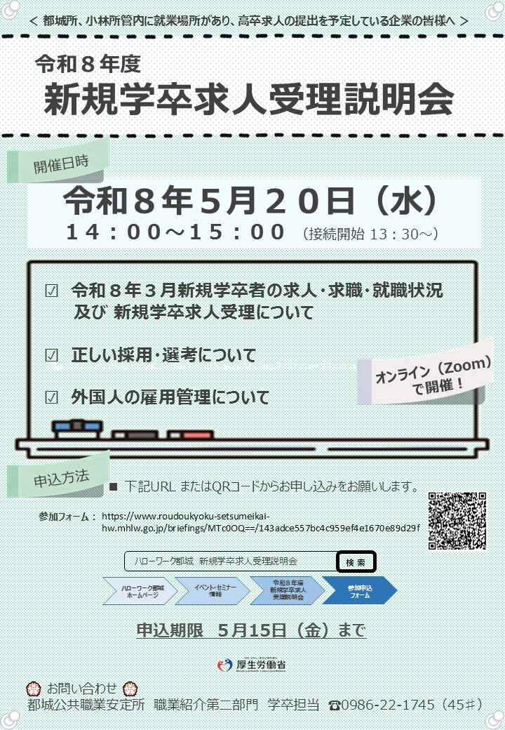 なお、当日の資料につきましては、開催日5日程度前に都城公共職業安定所のホームページに掲載いたします。