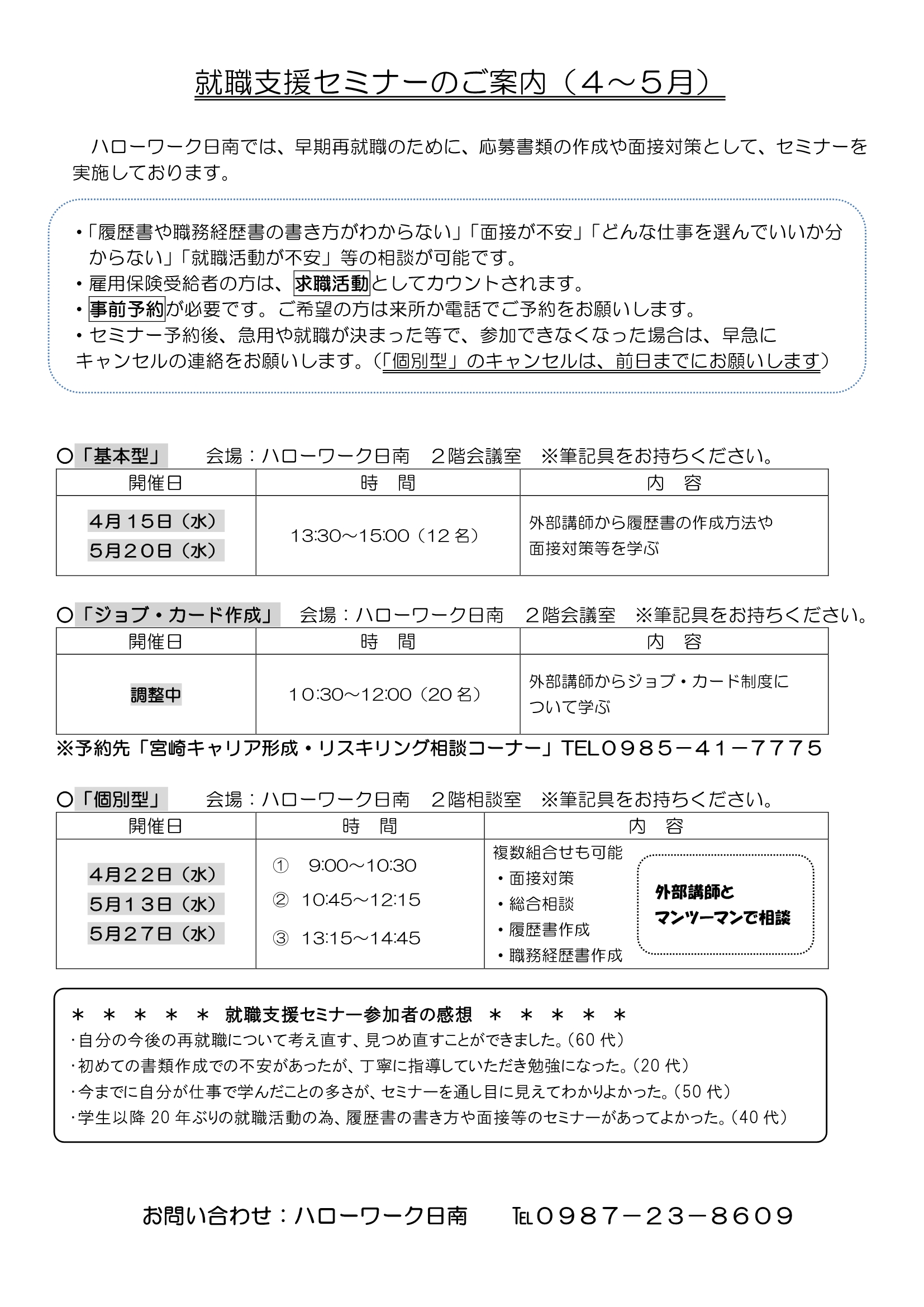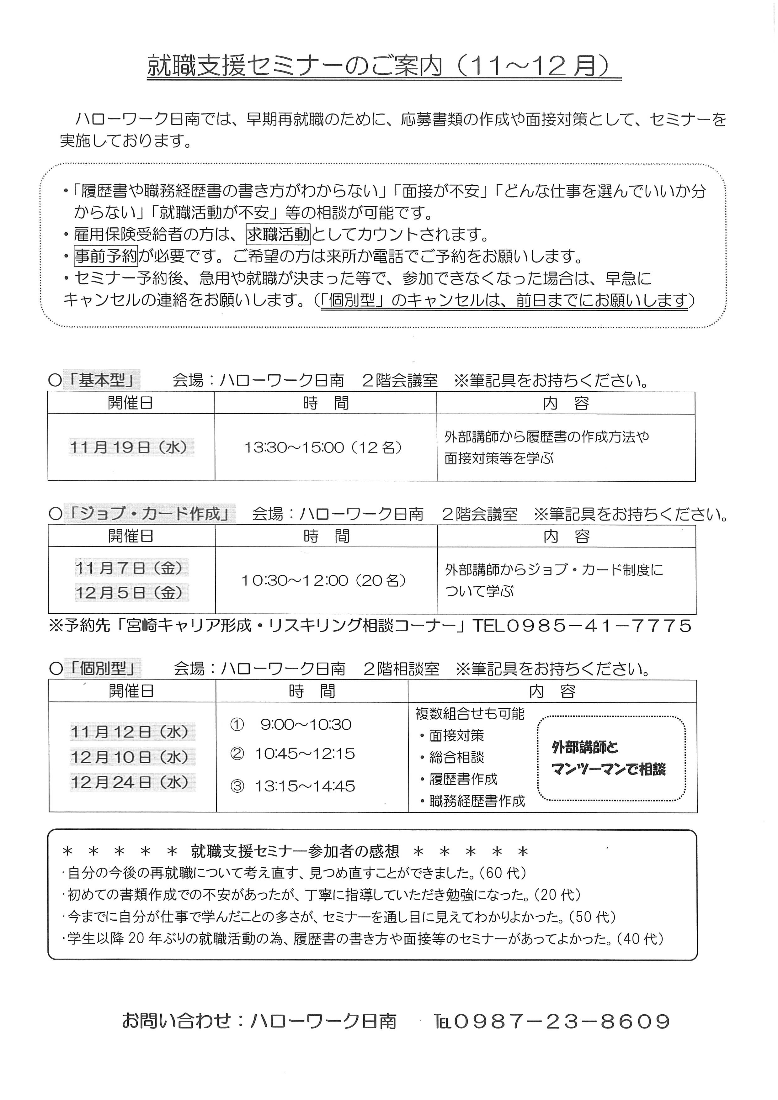 ハローワーク日南では、就職説明会やセミナーなど定期的に開催しております。全て無料で参加できます。ぜひ、ご参加ください。【事業主の方】