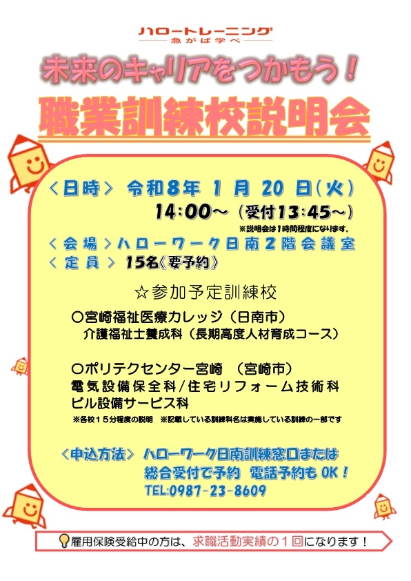 ●令和7年度 職業訓練校説明会【日時】:令和8年1月20日(火)14:00~(受付13:45~)