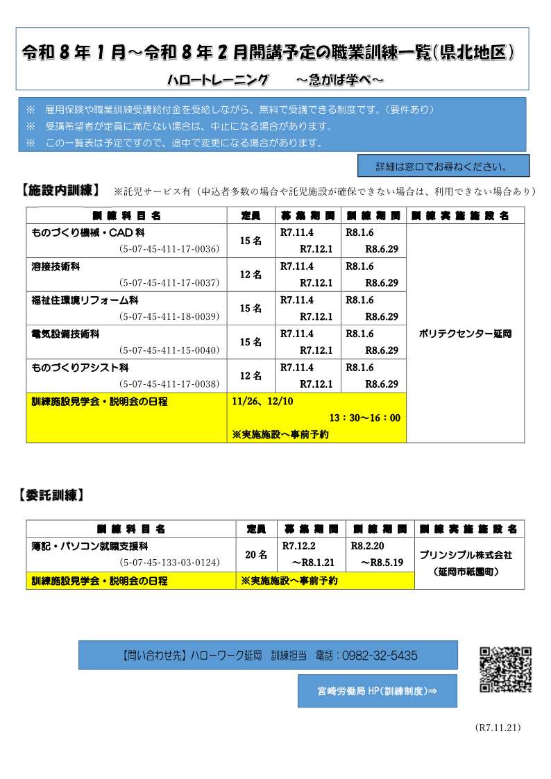 1.職業訓練のお知らせ(県北地域)(令和7年11月27日時点)令和8年1月~令和8年2月の開校予定の職業訓練一覧(県北地域)