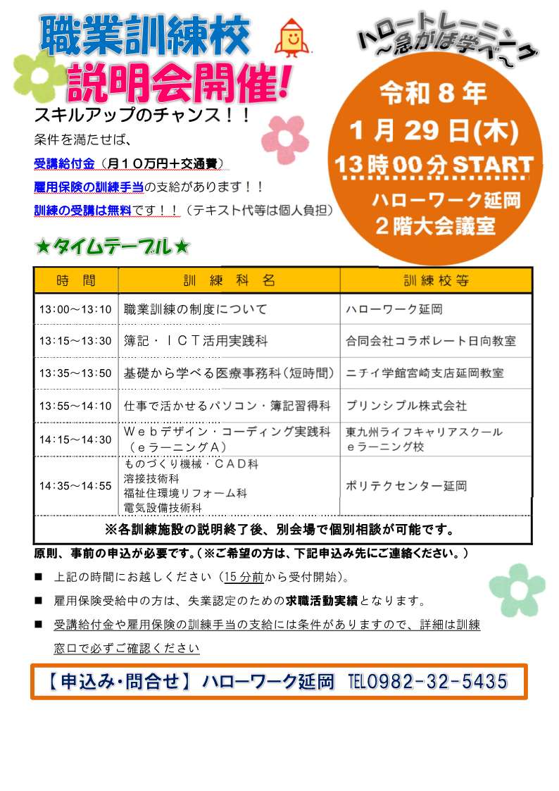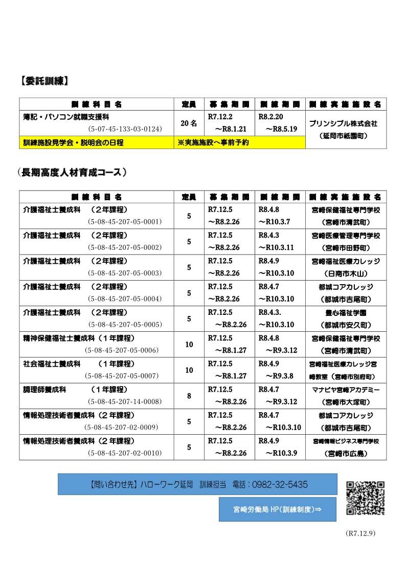 (参考)宮崎県内の開校予定は↓をクリック令和8年1~3月開講予定のハロートレーニング