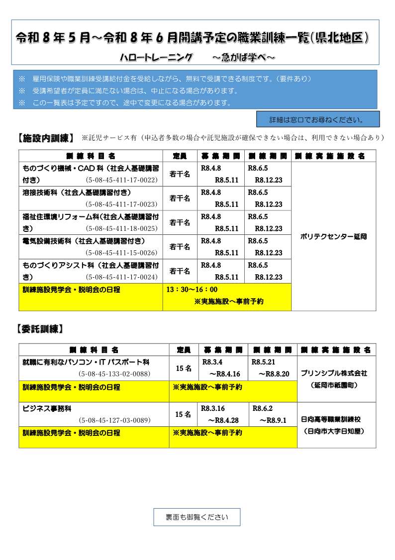 1.職業訓練のお知らせ(県北地域)(令和8年3月9日時点)令和8年5月~令和8年6月の開校予定の職業訓練一覧(県北地域)