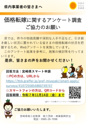 宮崎県が、昨今の物価高騰や深刻な人手不足など、引き続 き厳しい状況に置かれている県内企業の皆さまの価格転嫁の状況を把 握するため、Webアンケートを実施しています。
