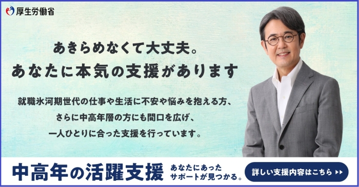 中高年世代の方々がすぐにでも利用できる施設・施策について紹介をされているページです。「安定した職に就きたい」、「生活に困りごとや不安を抱えている」等、個々の状況を踏まえた支援策等について掲載されています。