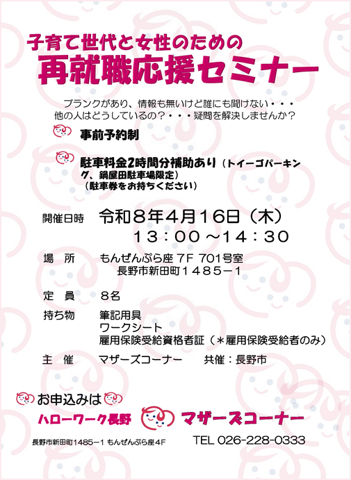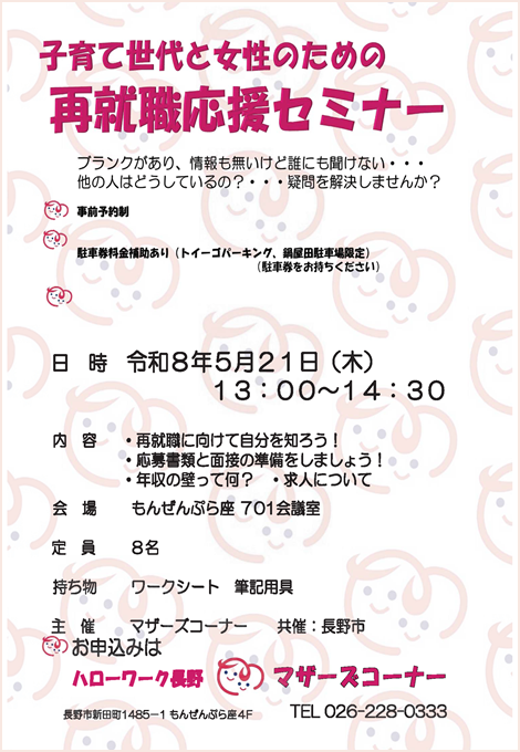 本セミナーでは、キャリアガイダンス、就職活動のノウハウ、求人動向や市場情報提供など再就職に役立つ情報を提供いたします。 詳しい日程お申込みは、ハローワーク長野 マザーズコーナーまでお問合せください。 TEL 026-228-0333 |