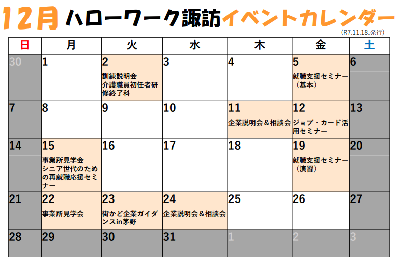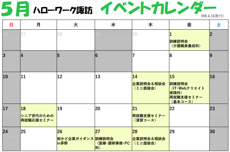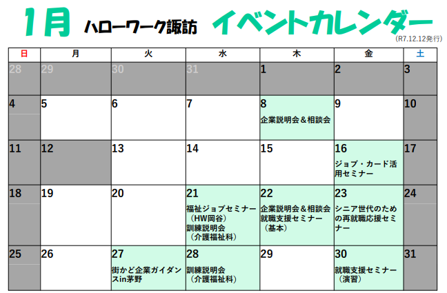 リーフレット等の掲載が無いイベントにつきましては、ハローワーク諏訪にお問い合わせください。