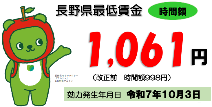 長野県最低賃金 | 1,061円 | 令和7年10月3日 |