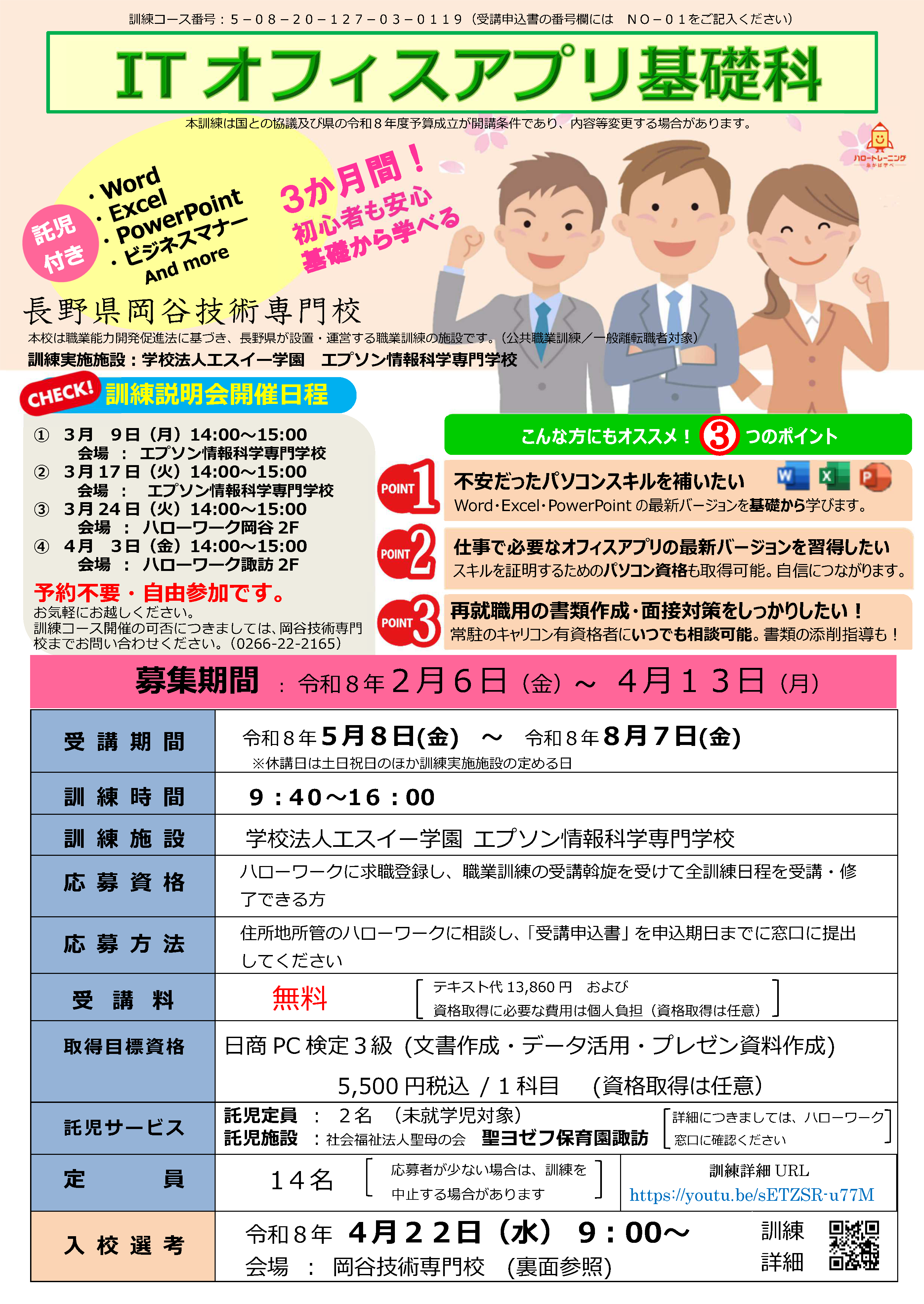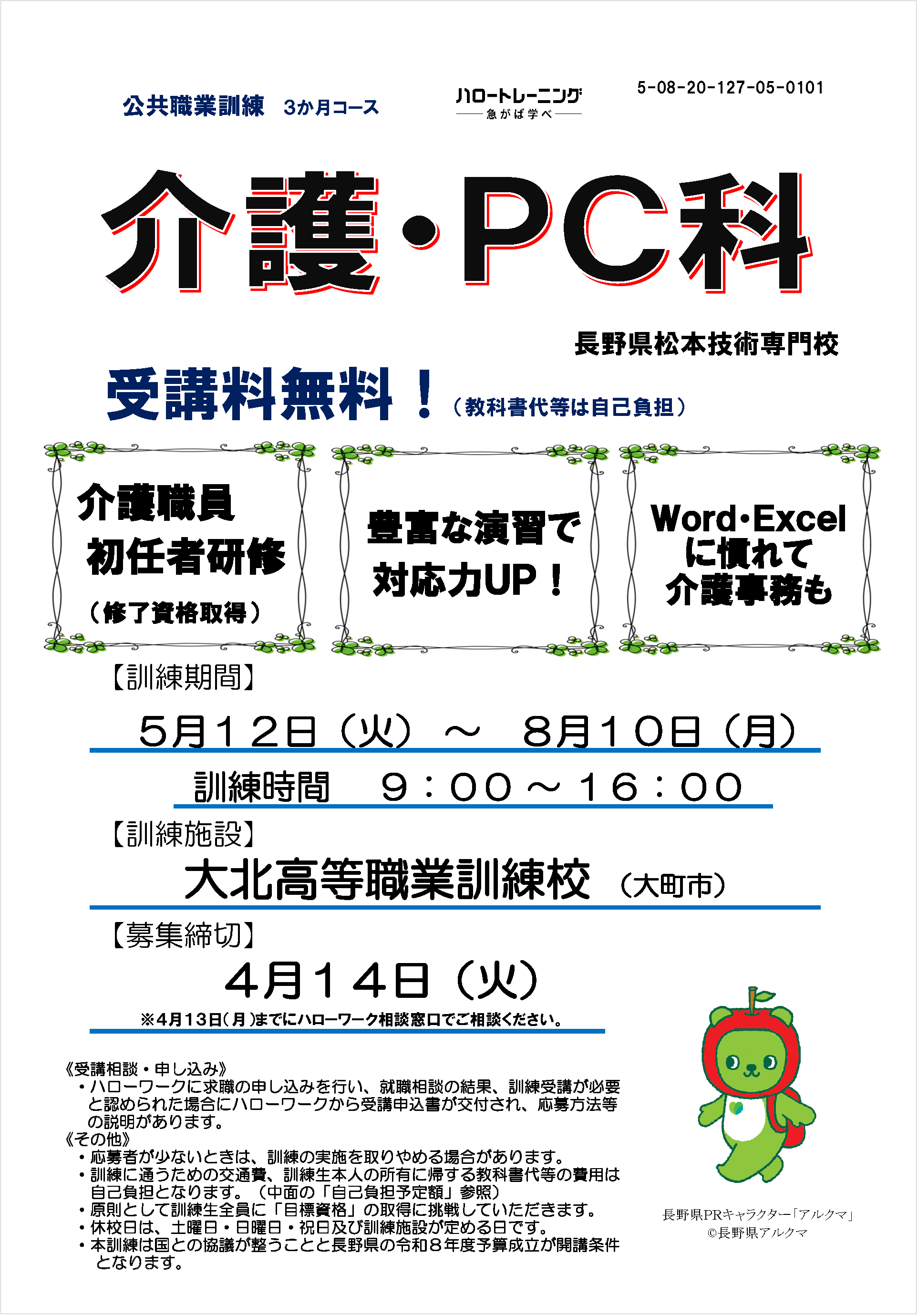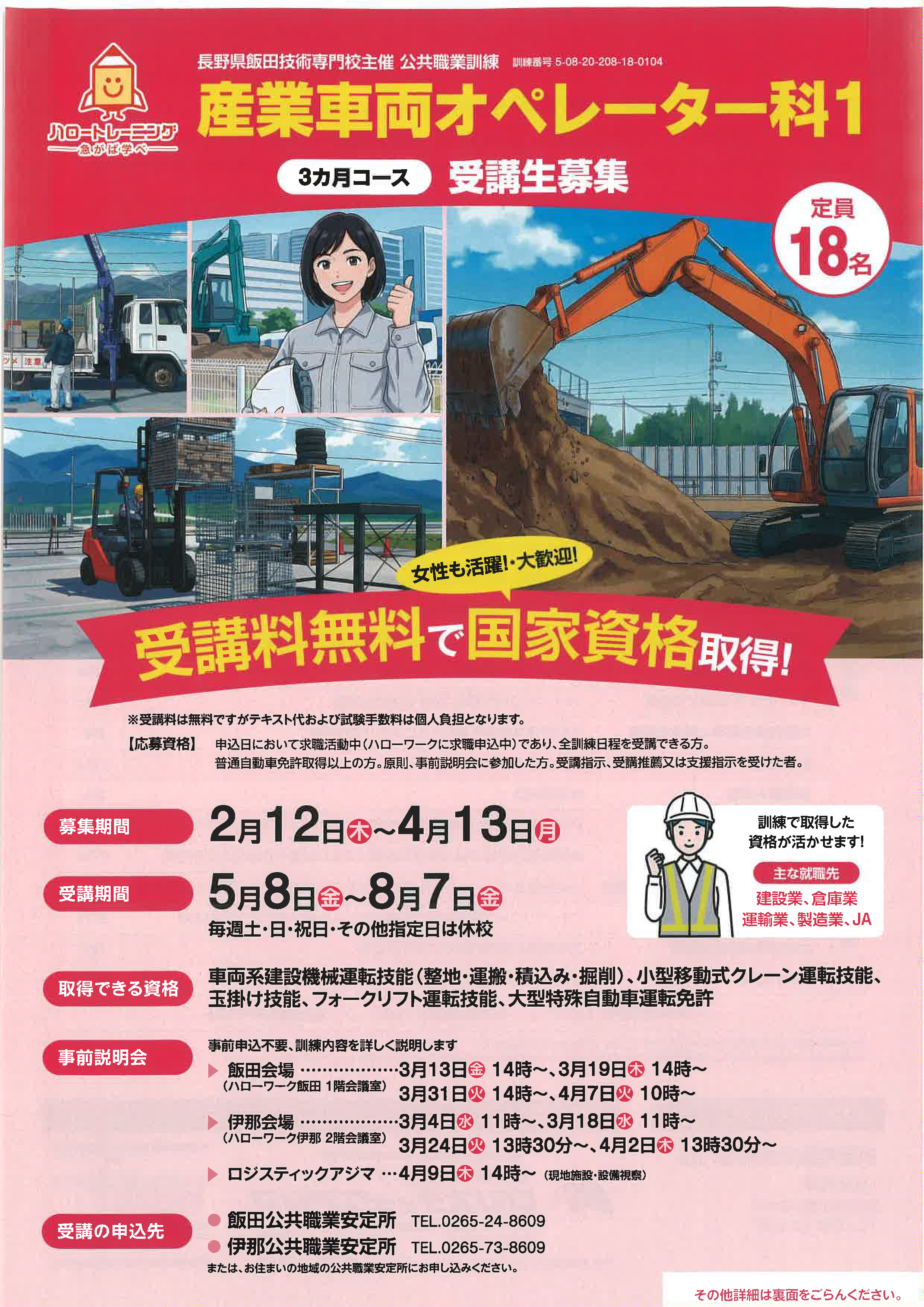 | 産業車両オペレーター科1(喬木村)4/13締切 | 建設アシスタント養成科(上田市)4/13締切 | |