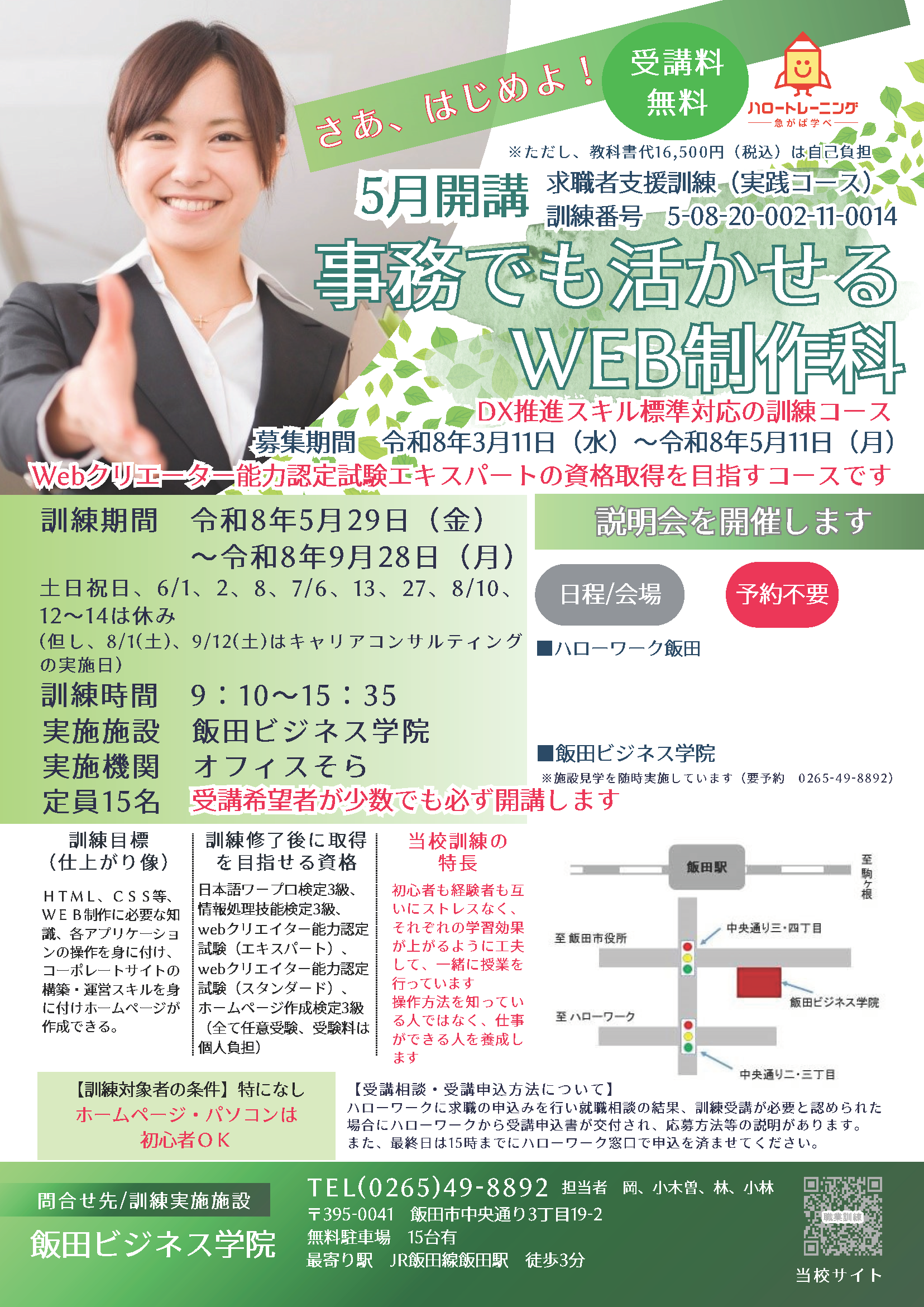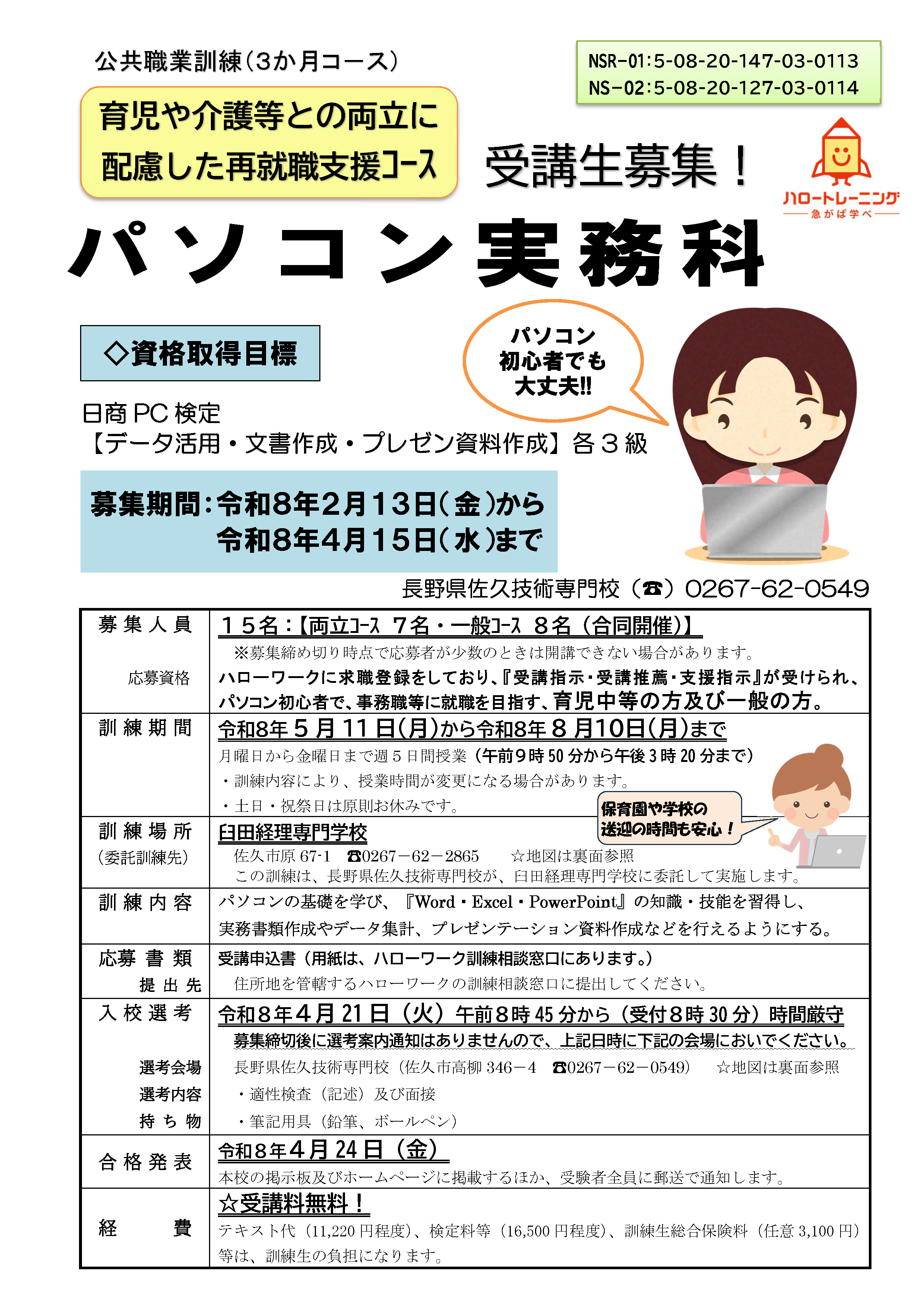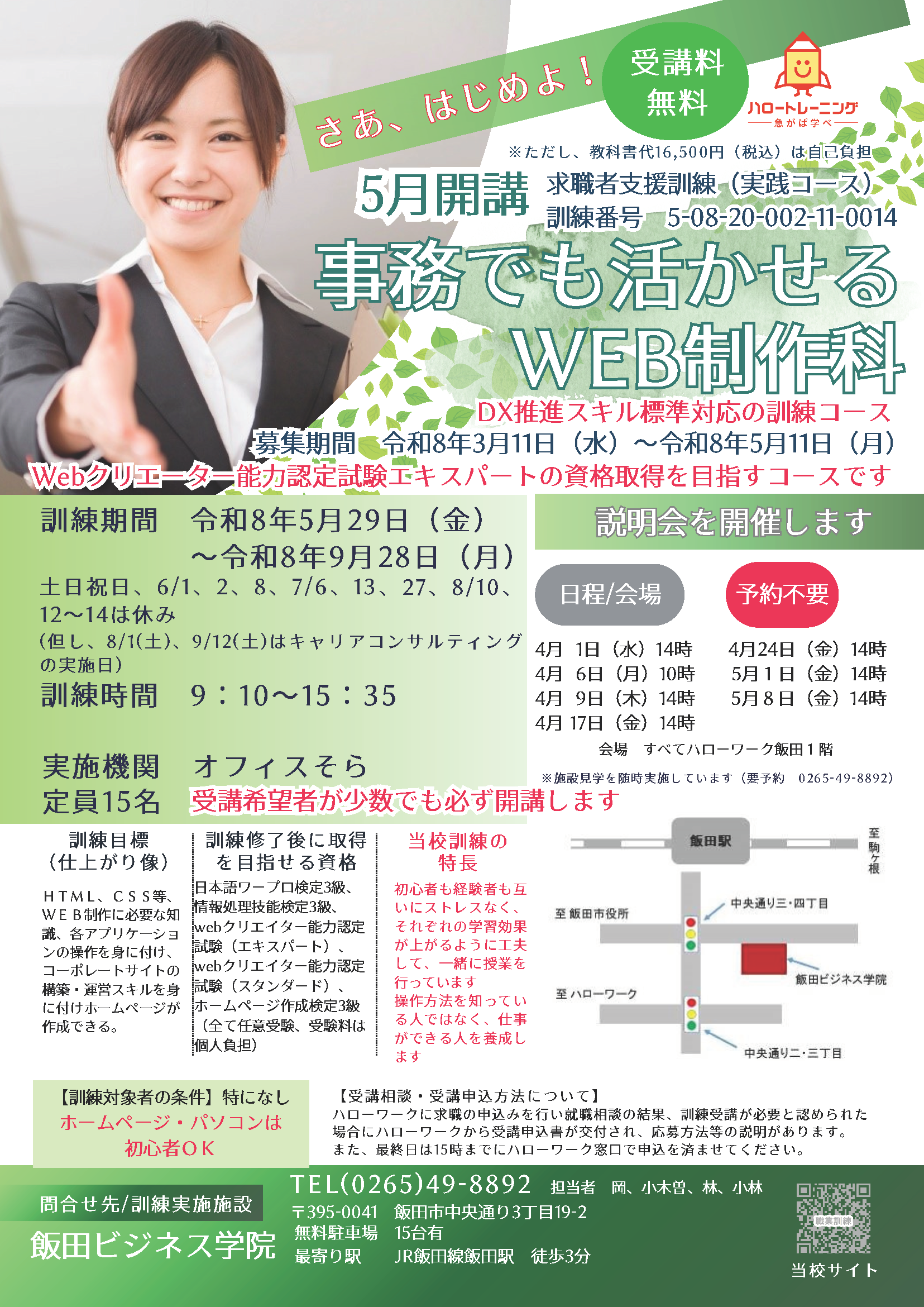 | Webデザイン科(eラーニングA)(自宅)4/27締切 | 事務でも活かせるWEB制作科(飯田市)5/11締切 | |