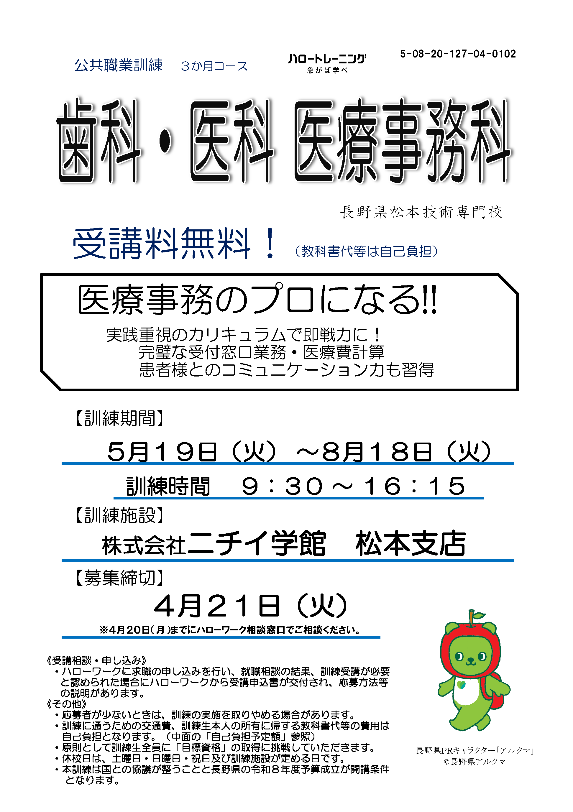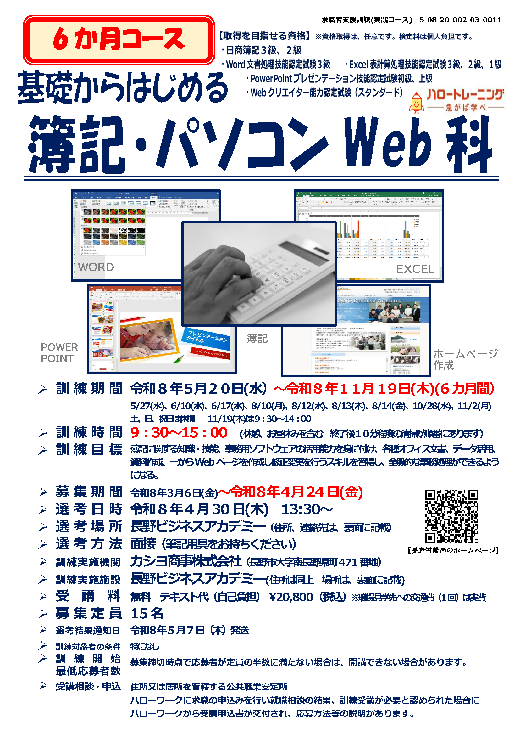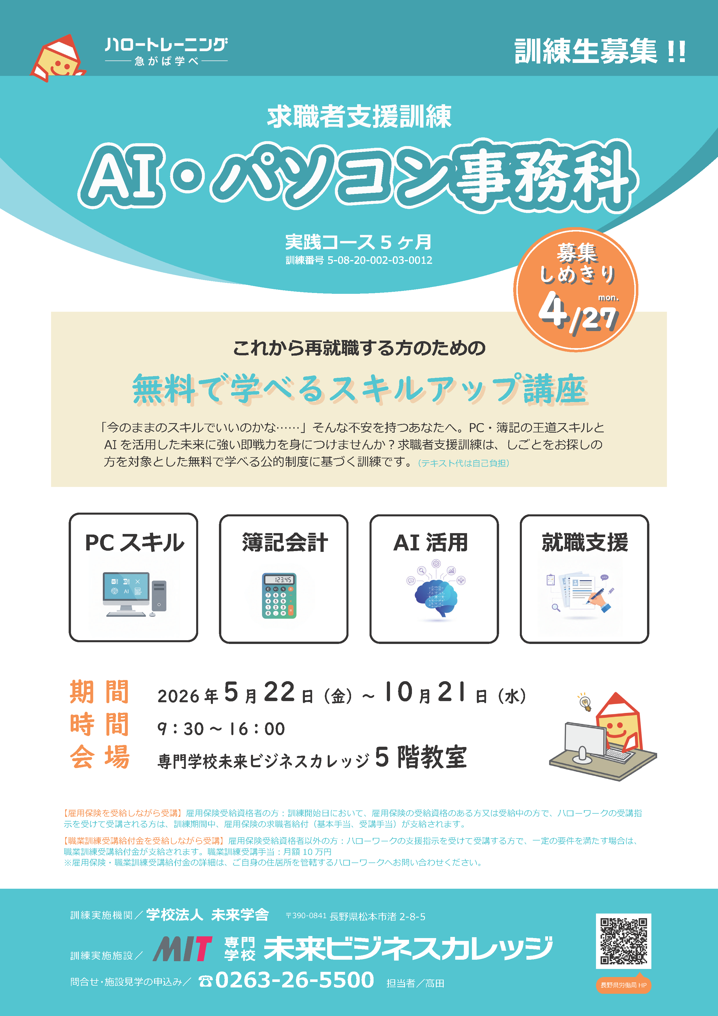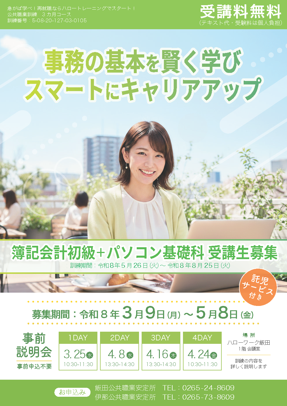 | Webデザイン科(eラーニングA)(自宅)4/27締切 | 事務でも活かせるWEB制作科(飯田市)5/11締切 | |