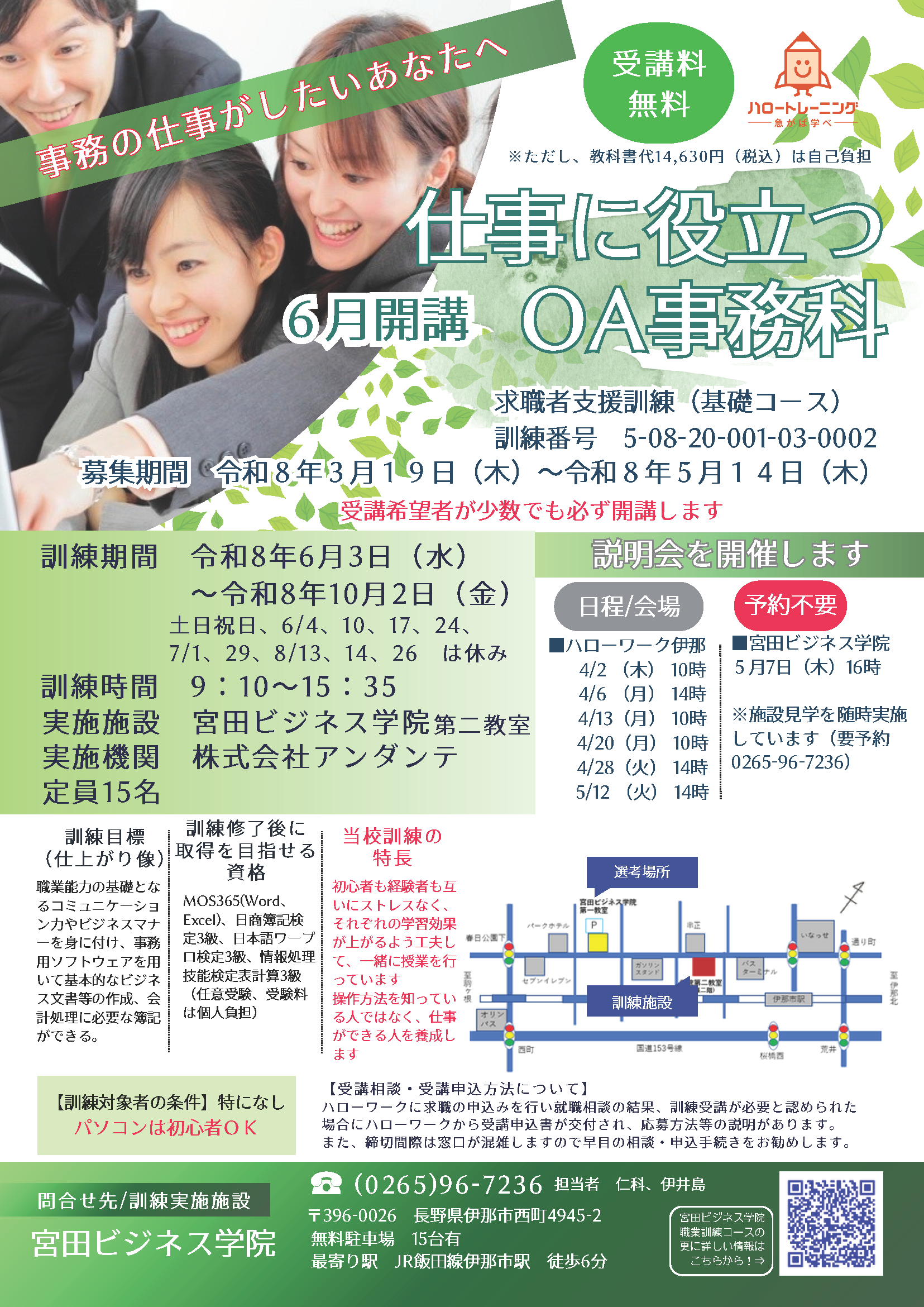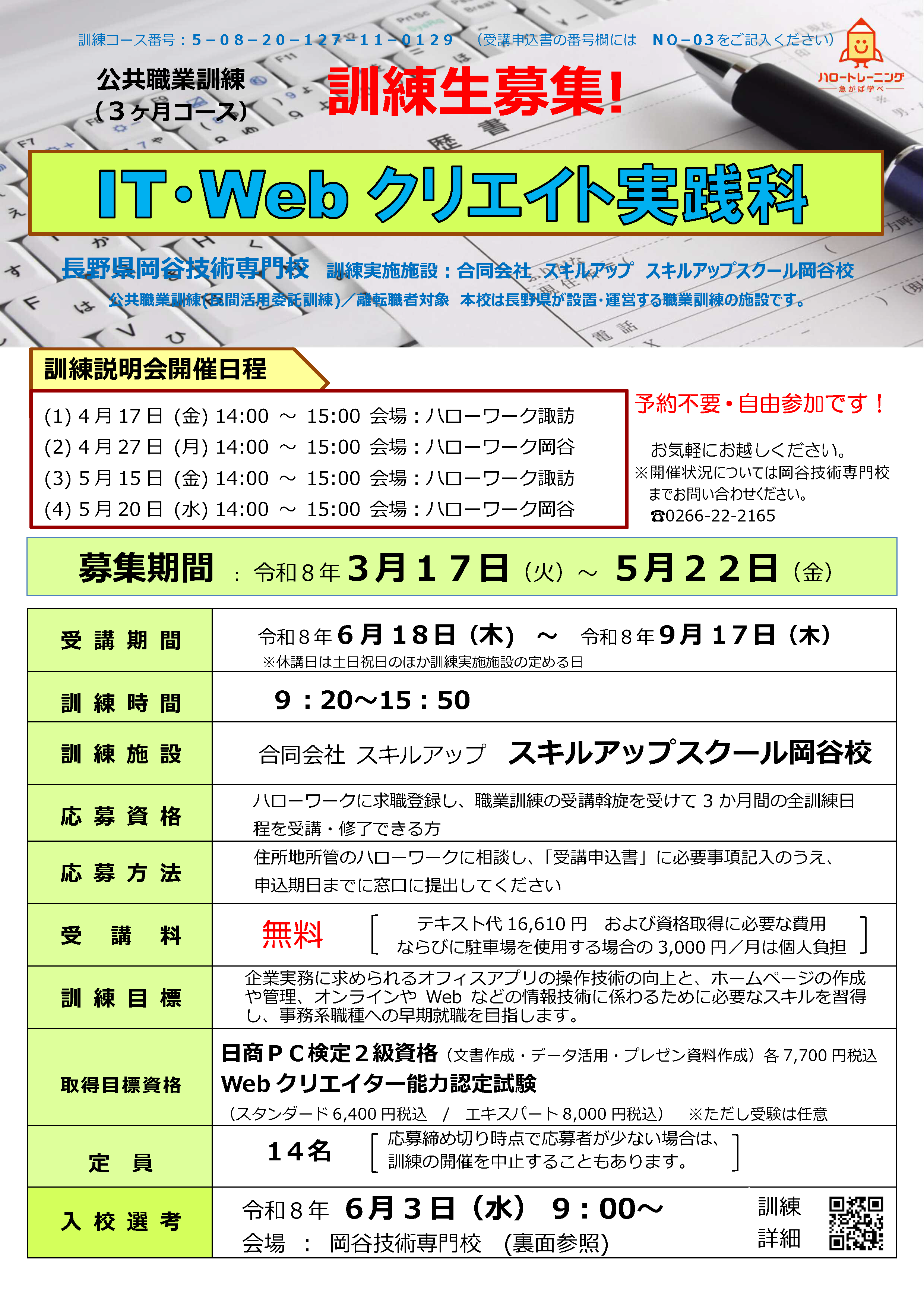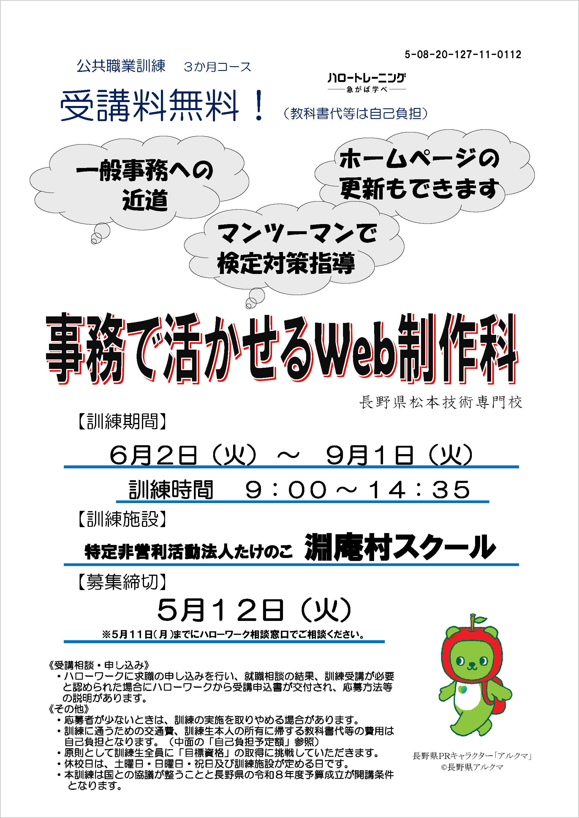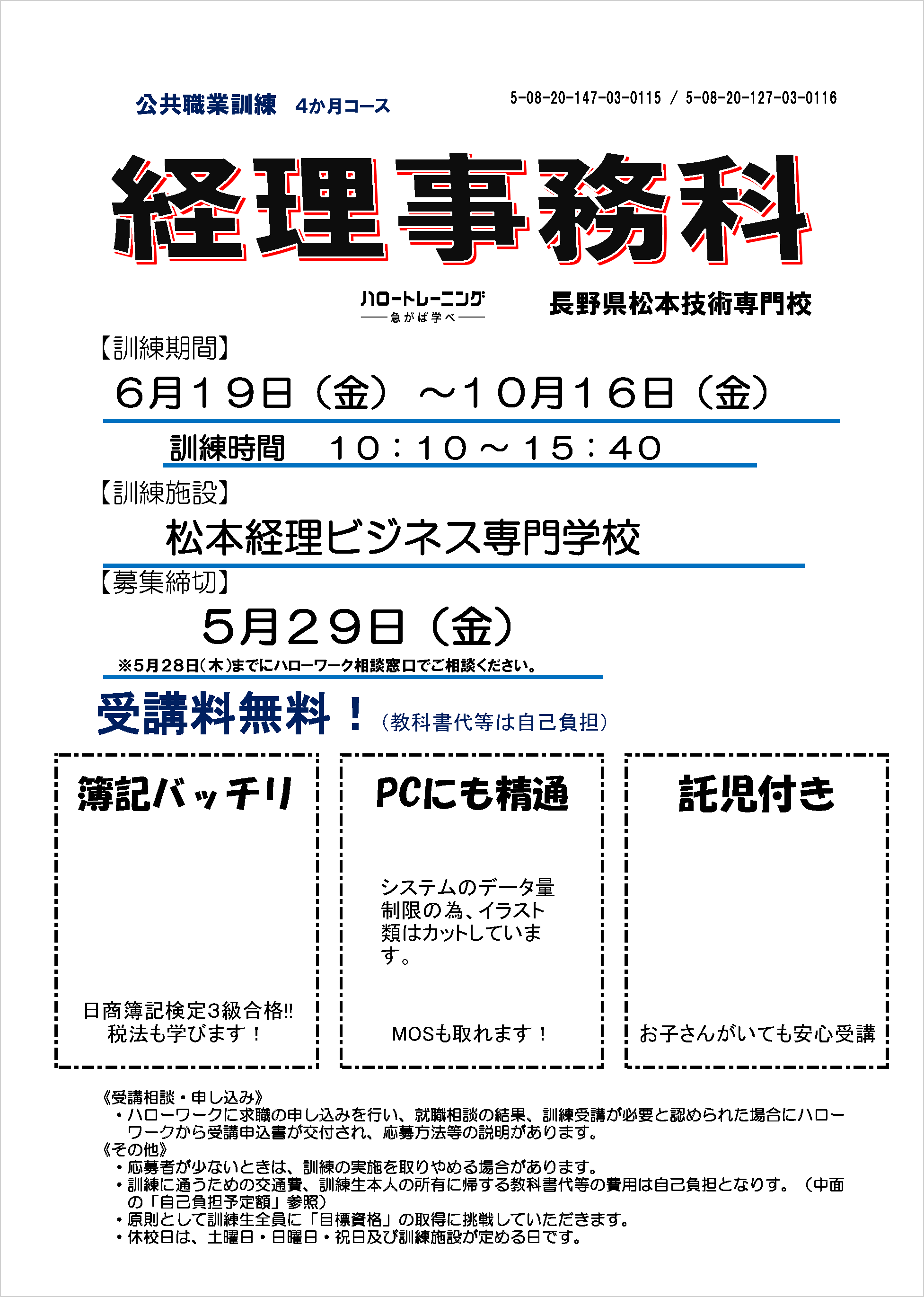 | 事務で活かせるWeb制作科(松本市)5/12締切 | Web+OA事務科(伊那市)5/21締切 | |