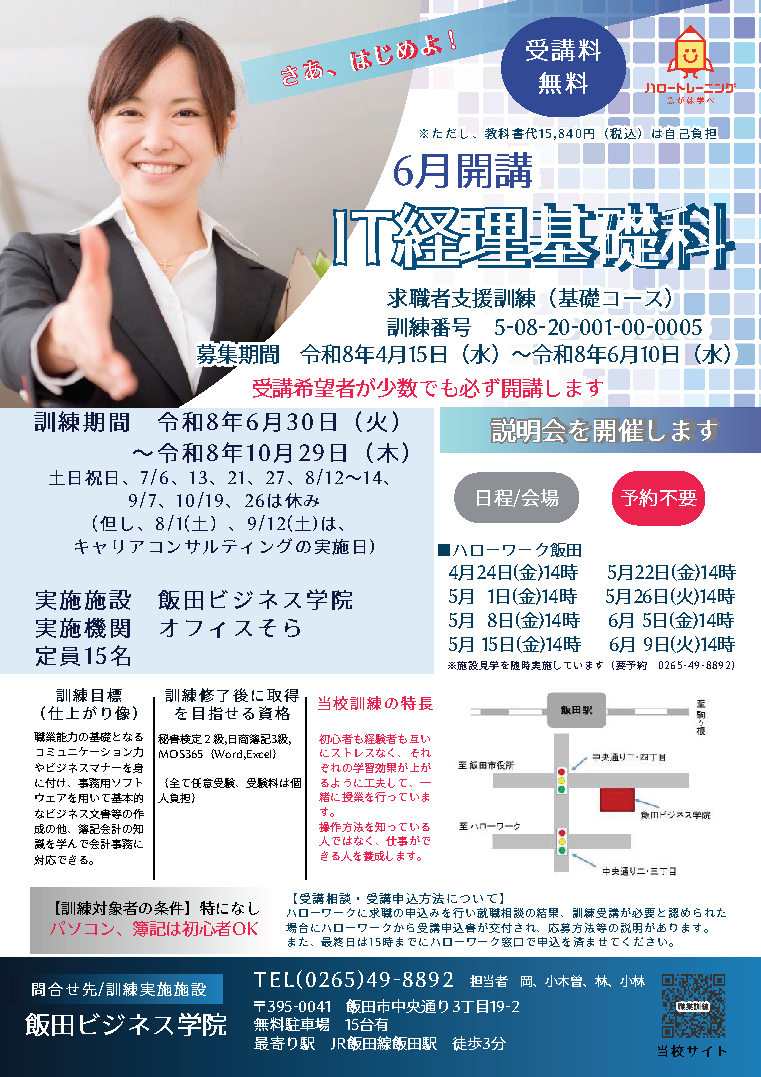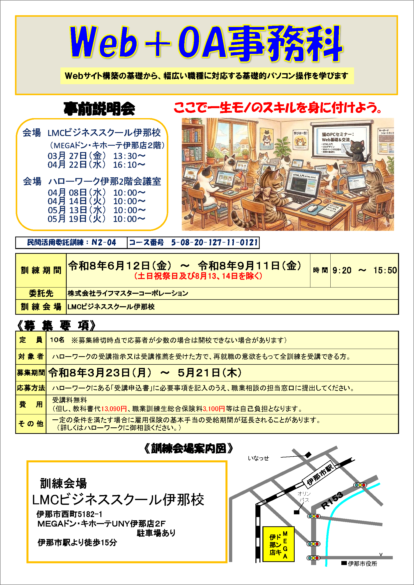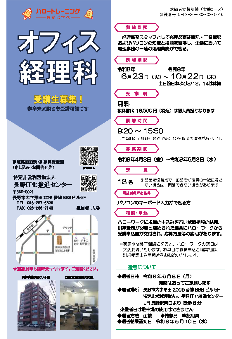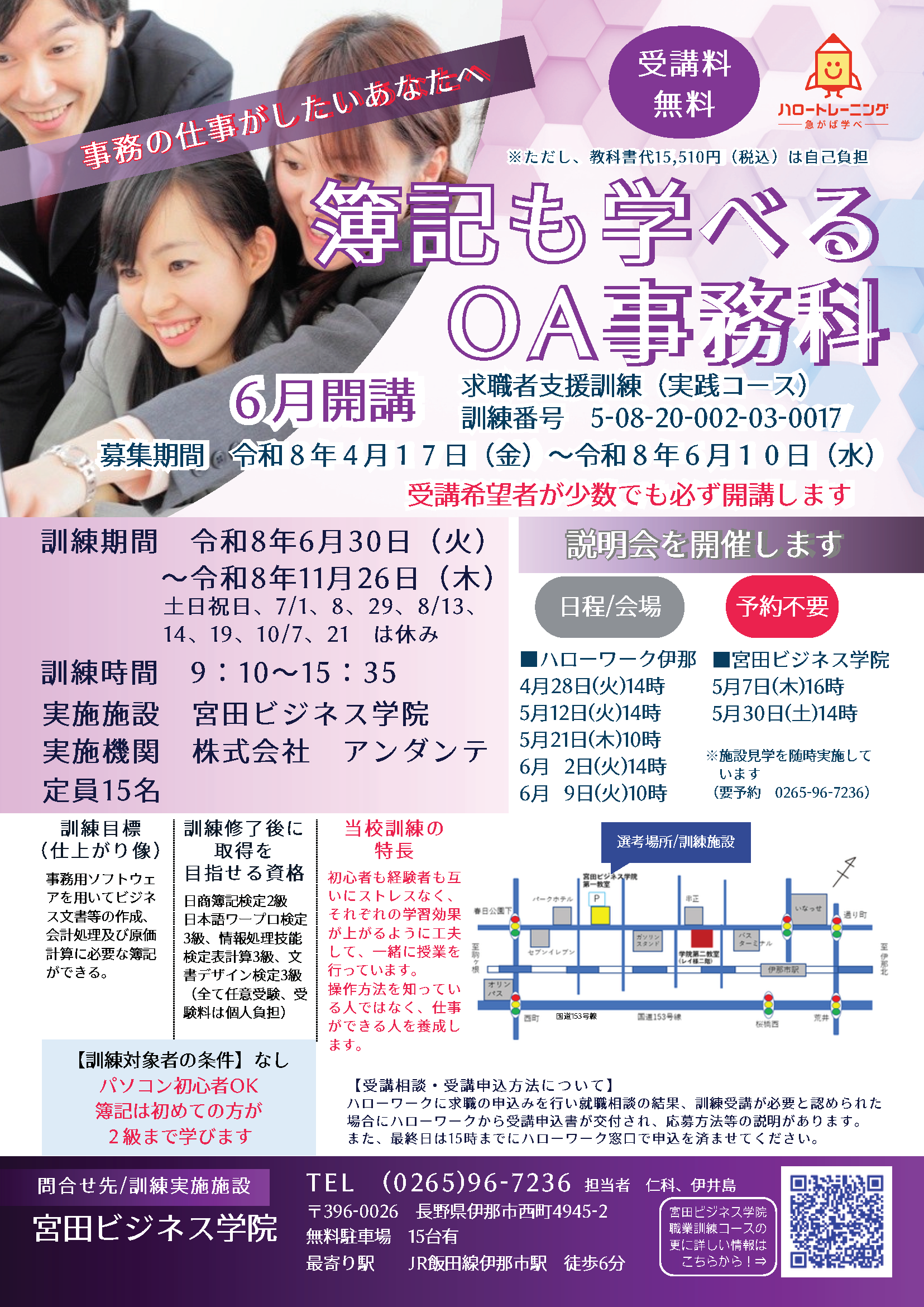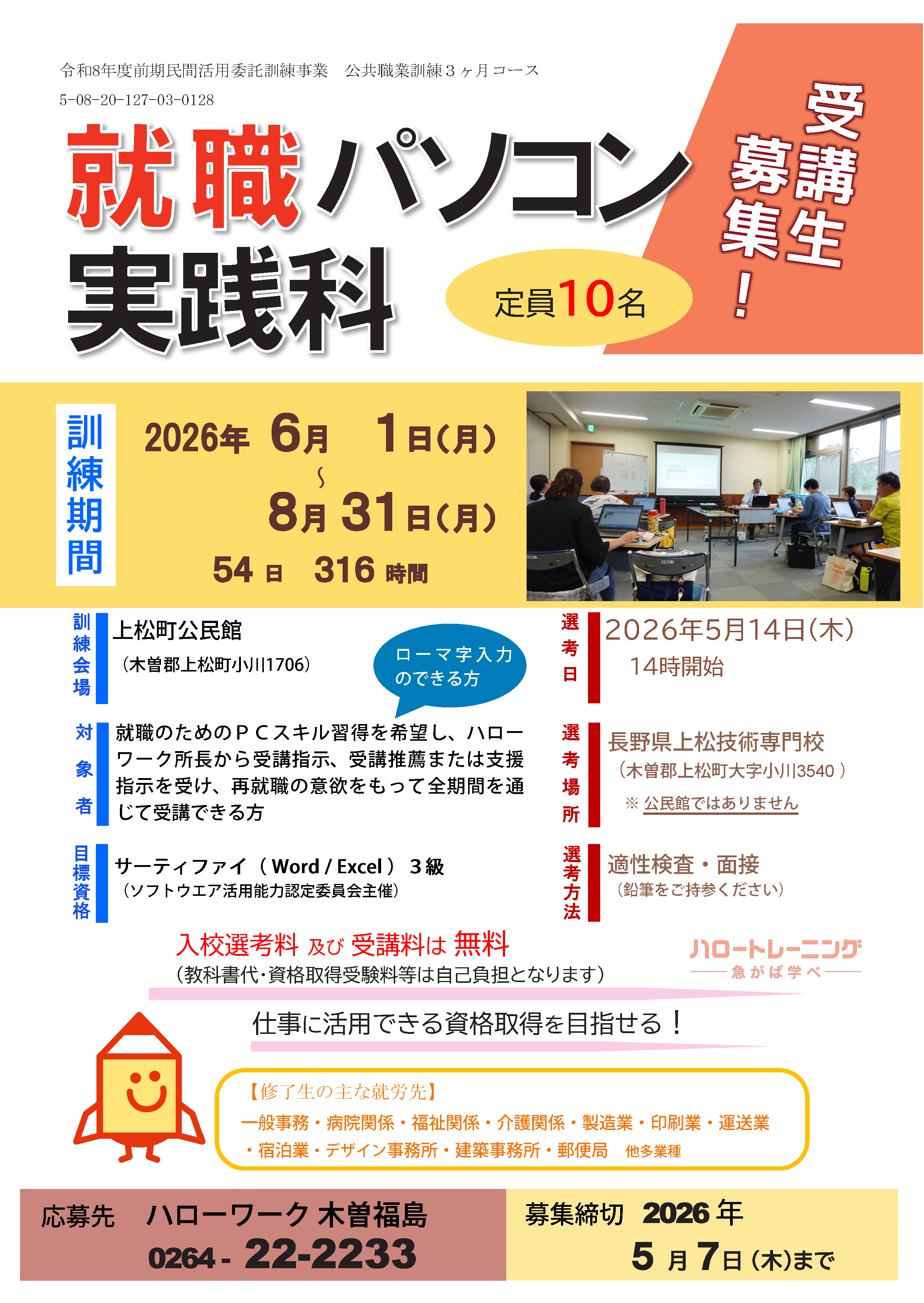 | 事務で活かせるWeb制作科(松本市)5/12締切 | Web+OA事務科(伊那市)5/21締切 | |