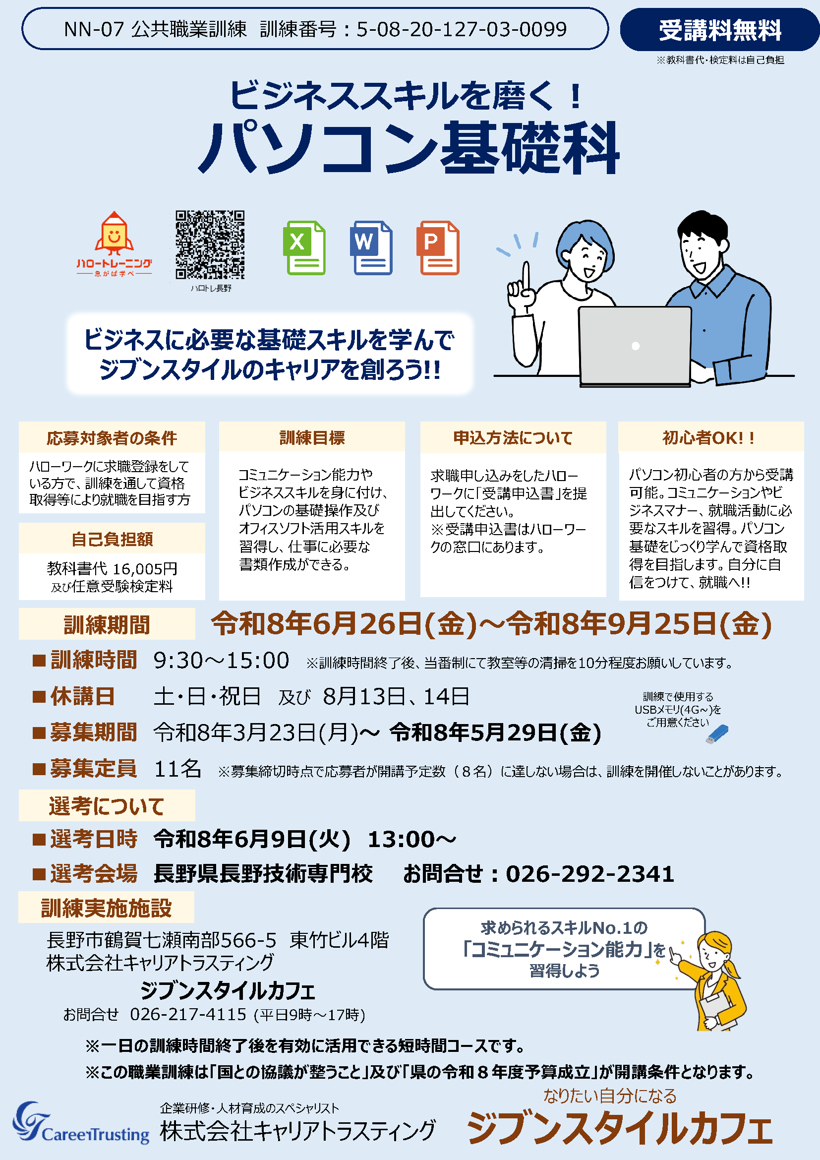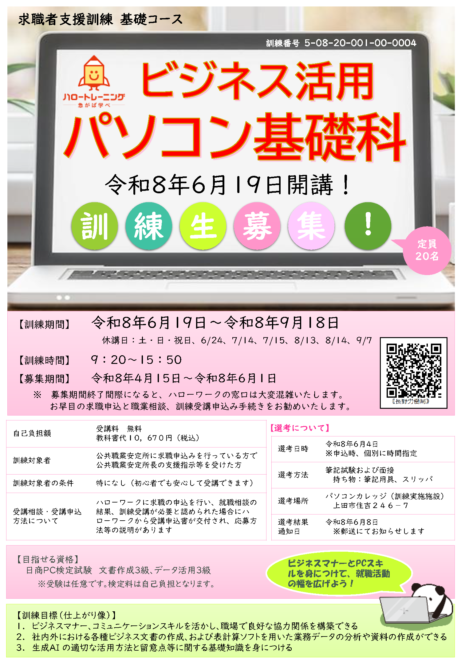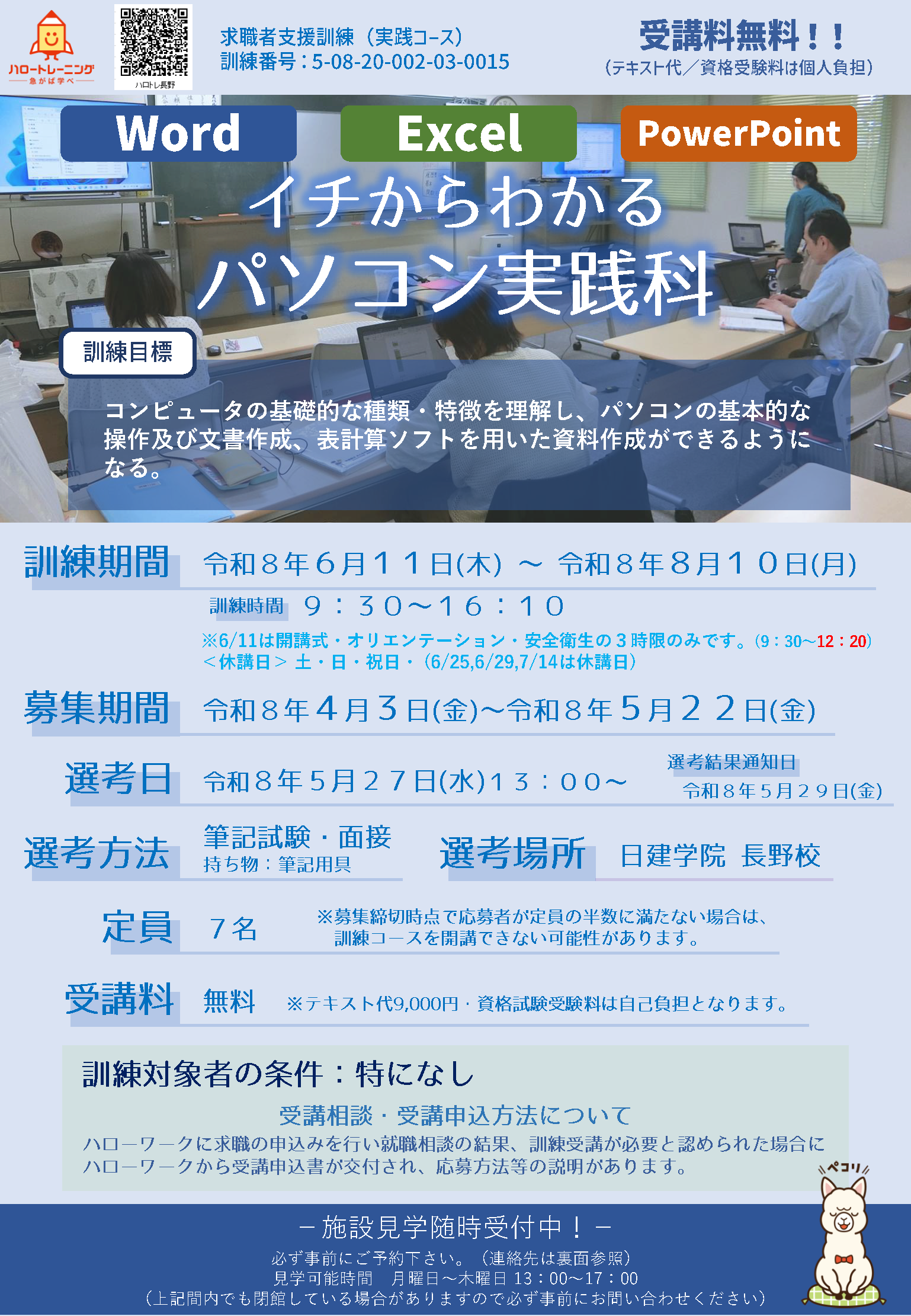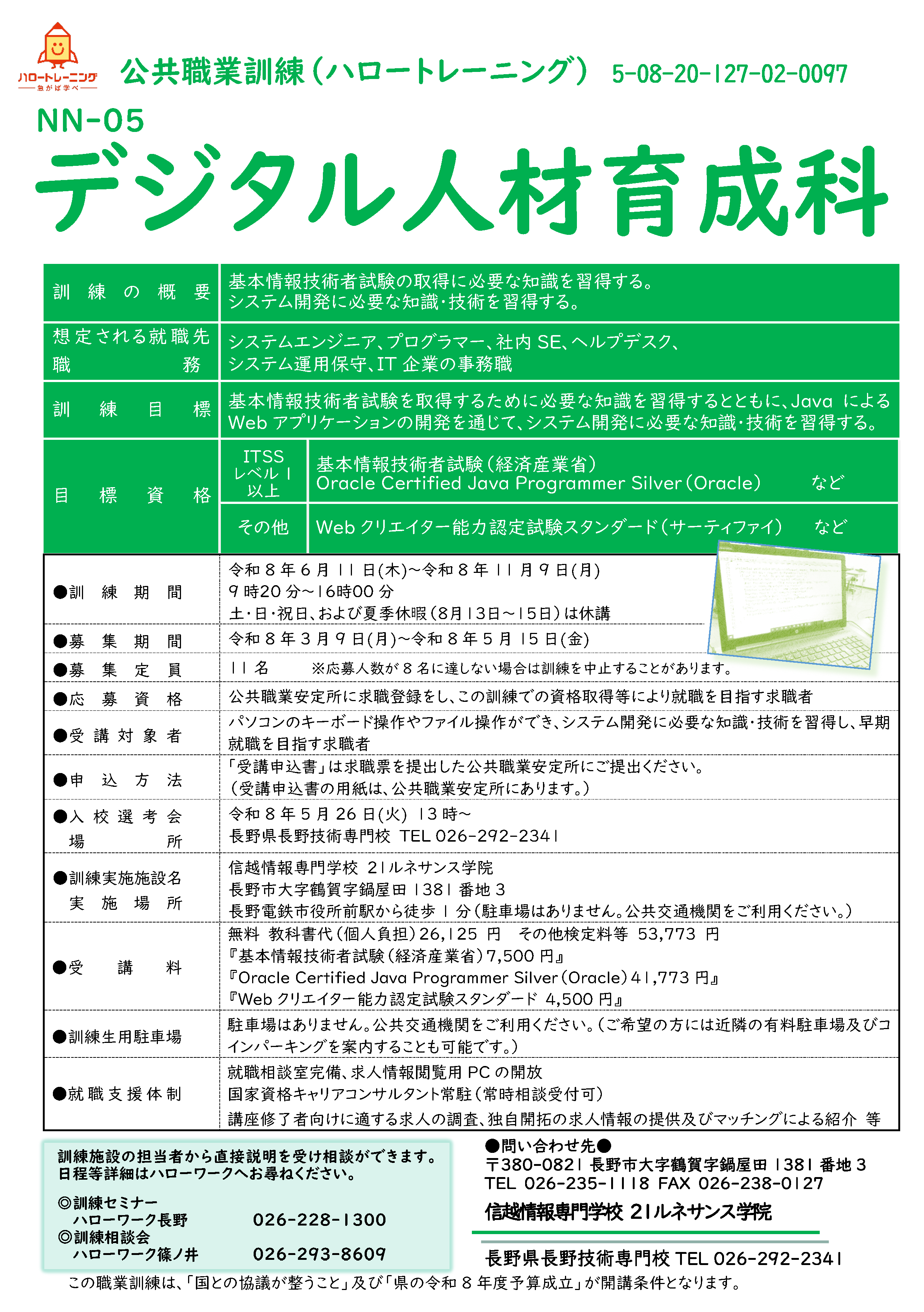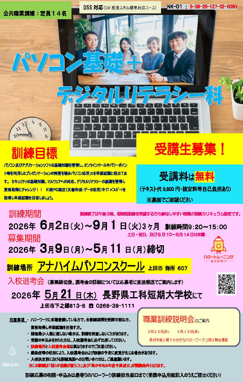 | パソコン基礎+デジタルリテラシー科(上田市)5/11締切 | デジタル人材育成科(長野市)5/15締切 | |