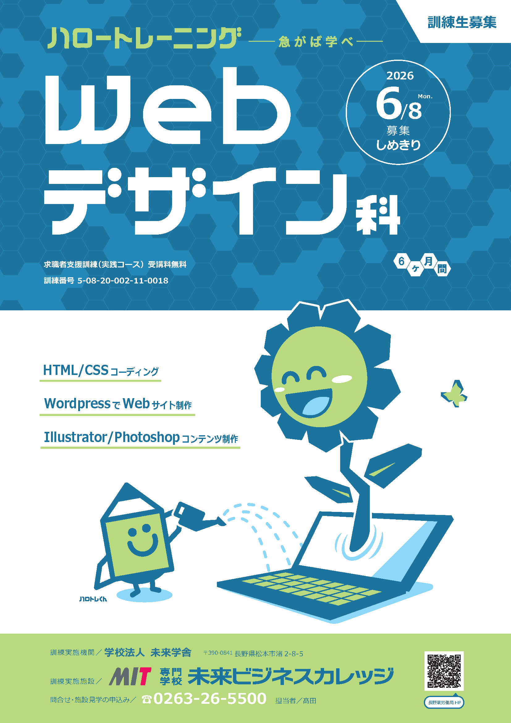 | IT・Webクリエイト実践科(岡谷市)5/22締切 | Webデザイン科(松本市)6/8締切 | |