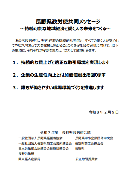 長野県内における適切な価格転嫁等を通じた賃金引上げ等の気運の醸成、生産性の向上等を進めていく観点から、政労使それぞれの立場から発言・意見交換を行い、『長野県政労使共同メッセージ』を採択しました。