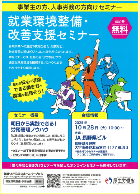 - 就業環境整備セミナー、過重労働解消のためのセミナーが開催されます(現地又はオンライン参加)