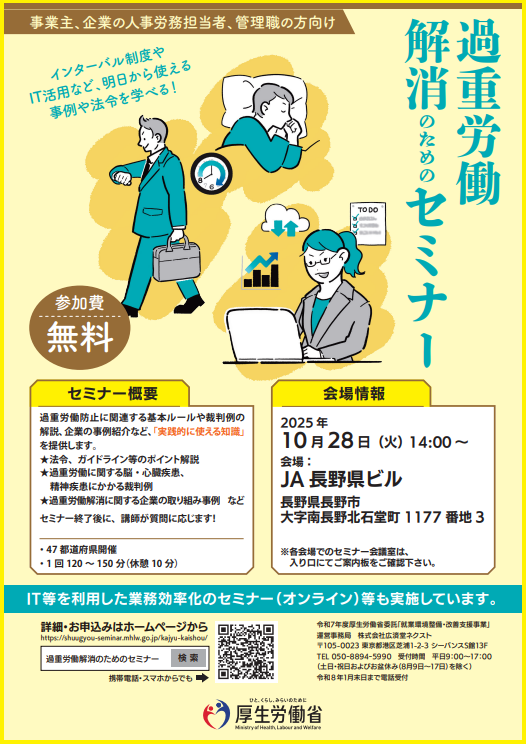 就業環境整備セミナー、過重労働解消のためのセミナーが開催されます(現地又はオンライン参加)
