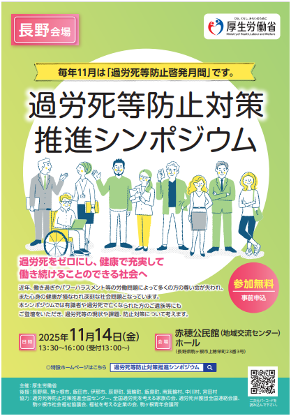 過労死等を防止することの重要性について国民の関心と理解を深めるため、令和7年11月14日(金)に、過労死等防止対策推進シンポジウムを開催します(本年度は駒ヶ根市です)