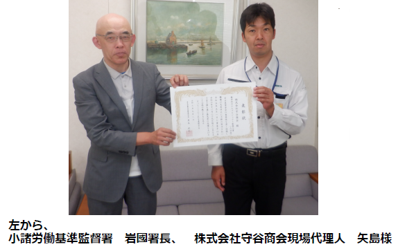 小諸労働基準監督署(署長 岩國眞一郎)は、株式会社守谷商会(軽井沢ホテルプロジェクト新築工事(A計画)において令和5年5月1日から令和6年11月29日までの全工期を通じ、無災害であったとして、建設事業無災害(厚生労働省労働基準局長)表彰を行いました。 厚生労働省では、労働安全衛生に関して積極的な取組を行っている企業・企業名を公表し、社会的な認知を高め、より多くの企業に安全衛生の積極的な取組を促進するため、各種認定、表彰制度等を設けています。(安全衛生対策に取り組む事業者等(認定、表彰制度等)) |