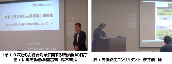 伊那労働基準監督署(署長 鈴木達人)は、一般社団法人伊那労働基準協会と共催により、粉じん作業を行う事業場を対象とした「第10次粉じん総合対策に関する研修会」を実施しました。 伊那労働基準監督署長によるあいさつの後、会の前半では、伊那労働基準監督署の労働基準監督官より第10次粉じん総合対策の概要を説明、後半は、さくらい環境安全コンサルタント事務所の桜井優様より実務的な対策について講演いただきました。 |