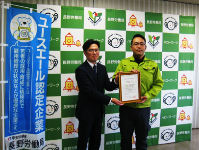 | 長野労働局(局長 三浦 栄一郎)は「ユースエール認定企業」として、令和7年12月15日付けで箕輪建設工業 株式会社を認定し、令和7年12月23日にハローワーク伊那で認定通知書交付式を行いました。 「ユースエール認定」とは若者の採用・育成に積極的で、若者の雇用管理の状況などが優良な中小企業を青少年の雇用の促進等に関する法律(若者雇用促進法)に基づき厚生労働大臣が認定する制度です。 企業の詳細は「若者雇用促進総合サイト」に掲載しています。 |