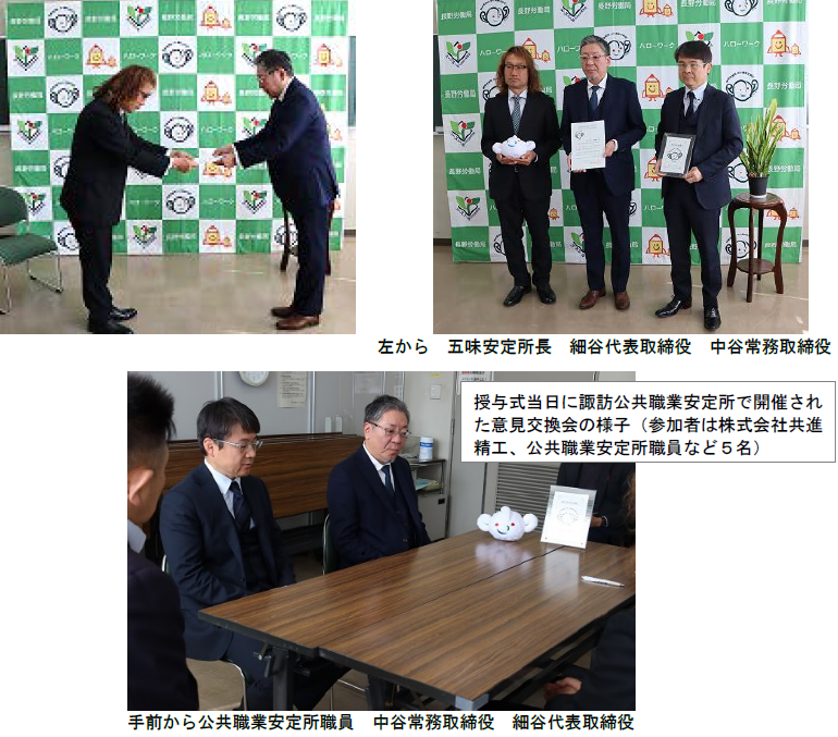 | 長野労働局(局長三浦栄一郎)は、もにす認定企業として、株式会社共進精工(代表取締役 細谷賢一)を認定し、令和8年3月10日に諏訪公共職業安定所において、認定通知書交付式を行いました。 「障害者雇用優良中小事業主認定(もにす認定)制度」とは、障害者の雇用の促進及び雇用の安定に関する取組の実施状況などが優良な中小事業主を厚生労働大臣が認定する制度です。 |