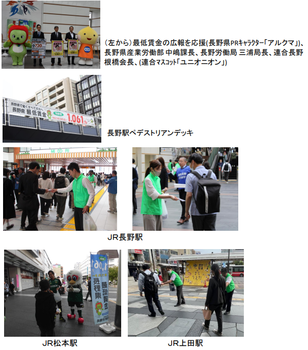 長野県最低賃金(令和7年10月3日から時間額1,061円)の周知啓発のため、JR長野駅において、長野県、連合長野と三者共同で街頭啓発(改定額を印刷したポケットティッシュ(リーフレット入り)約1,200個の配布)を行いました。 会場には、「事業者支援コーナー」を設置し、業務改善助成金(労働局)、上乗せ補助制度(長野県)の支援策リーフレット配布も行いました。 また、県下全域での周知啓発として、JR松本駅、JR上田駅、JR飯田駅においても、ポケットティッシュの配布を行いました。 長野県の最低賃金、最低賃金引き上げに係る支援事業等の各種情報はこちらをご覧ください。 |