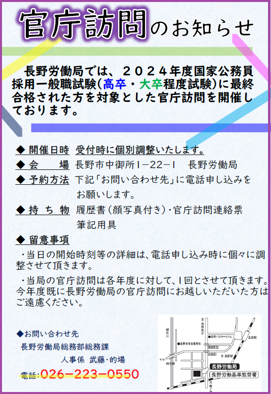 長野労働局 一般職(高卒程度)官庁訪問のお知らせ![]() |