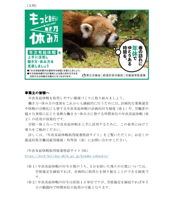 | 以下に、春季の「年次有給休暇取得促進期間」のリーフレット、ポスター等の電子データを掲示しています。広報誌等にご活用ください。 |