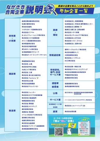 | 「ながさき合同企業説明会~長崎の企業を知ることから始めよう~」運営事務局 (委託企業)三松堂ホールディングス株式会社 TEL :03-6823-5362 e-mail:t-shirano@sanshodo.co.jp |