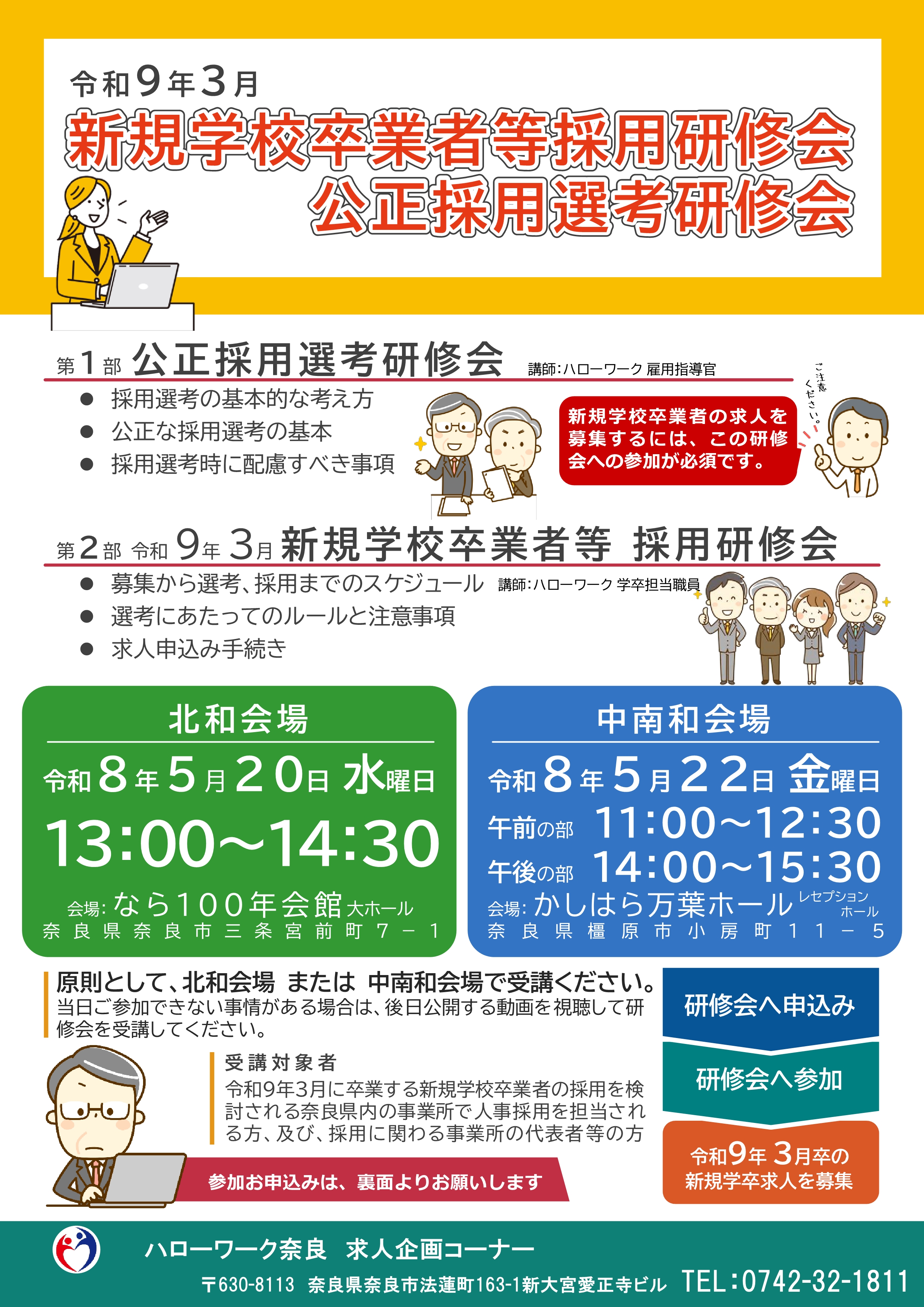 そのため、本年度の新規学校卒業者等採用研修会にご参加いただいていない事業主の方は、求人申込みをされる場合に、サイト内の「新規学卒者採用ルール」および「公正採用選考について」にある研修動画を必ずご覧になり、ご理解いただいたうえでお申し込みください。