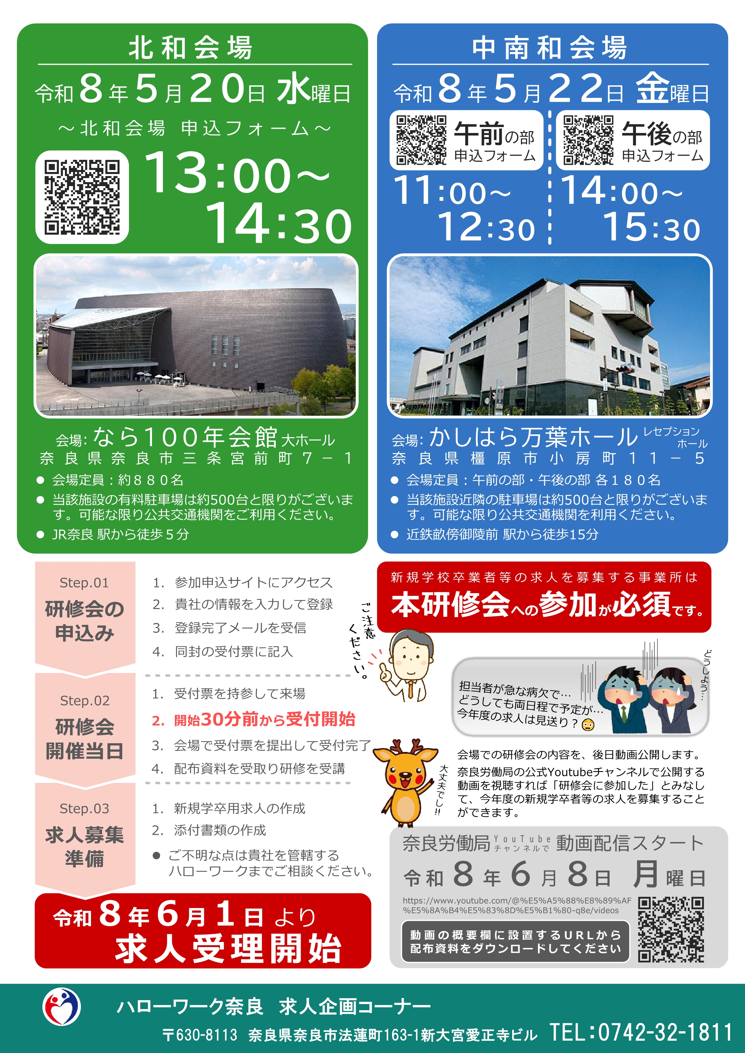 研修動画は、奈良労働局が発行している「新規学校卒業者等採用手引」の内容に基づいて説明いたします。また動画で使用しておりますスライド資料もお手元にご用意のうえご覧ください。 採用手引やスライド資料、各種様式については、下記リンク先の「各種様式について」からダウンロードできます。 また、必要書類および求人の申し込み方法等については、このサイト内の動画を参考いただきご準備ください。