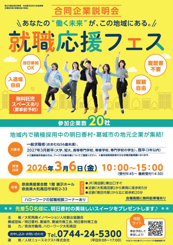 地域内で積極採用中の、明日香村・葛城市の地元企業20社が集結!地元で育つキャリア。地域で輝く人へ。