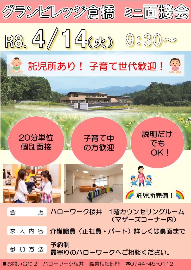 ・4/8(水)にグランビレッジ倉橋にて「職場見学ツアー」を開催いたします。