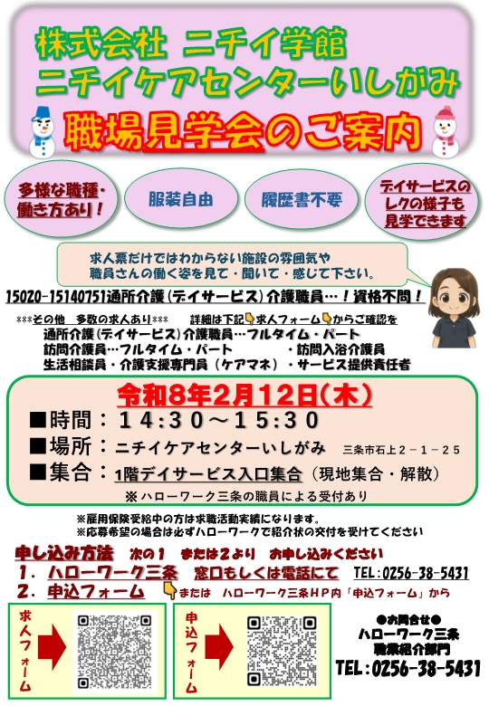 2月12日(木)職場見学会 ★デイサービス見学★ 様々な働き方や職種・資格研修についてもご案内!