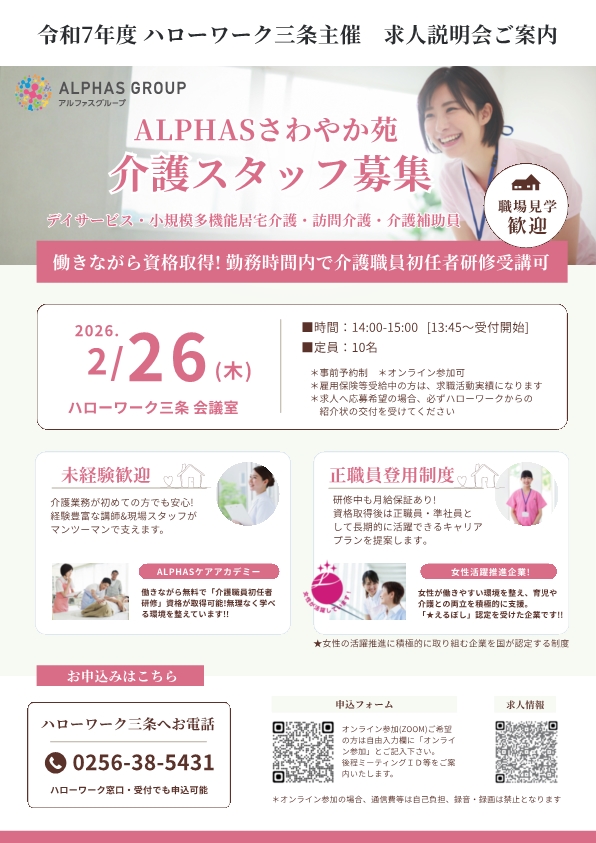 2/26(木) (株)クレアメディコ ALPHASさわやか苑三条東 介護スタッフ求人説明会
