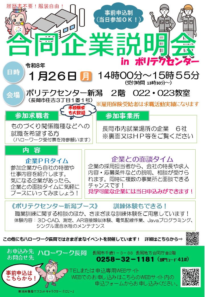 長岡市内を就業場所とする企業6社が参加する「合同企業説明会 in ポリテクセンター」を開催します。
