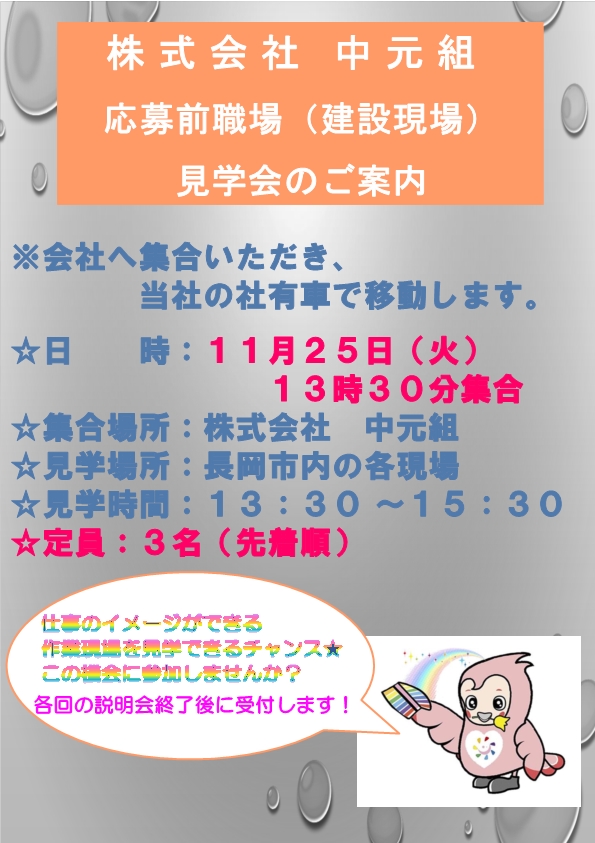仕事のイメージができる職場見学を開催いたしますので、この機会に是非参加してみませんか?