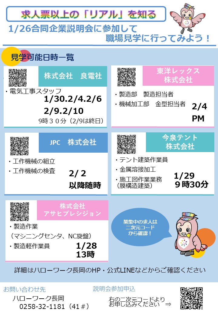 1/26(月)合同企業説明会参加企業 職場見学日程一覧