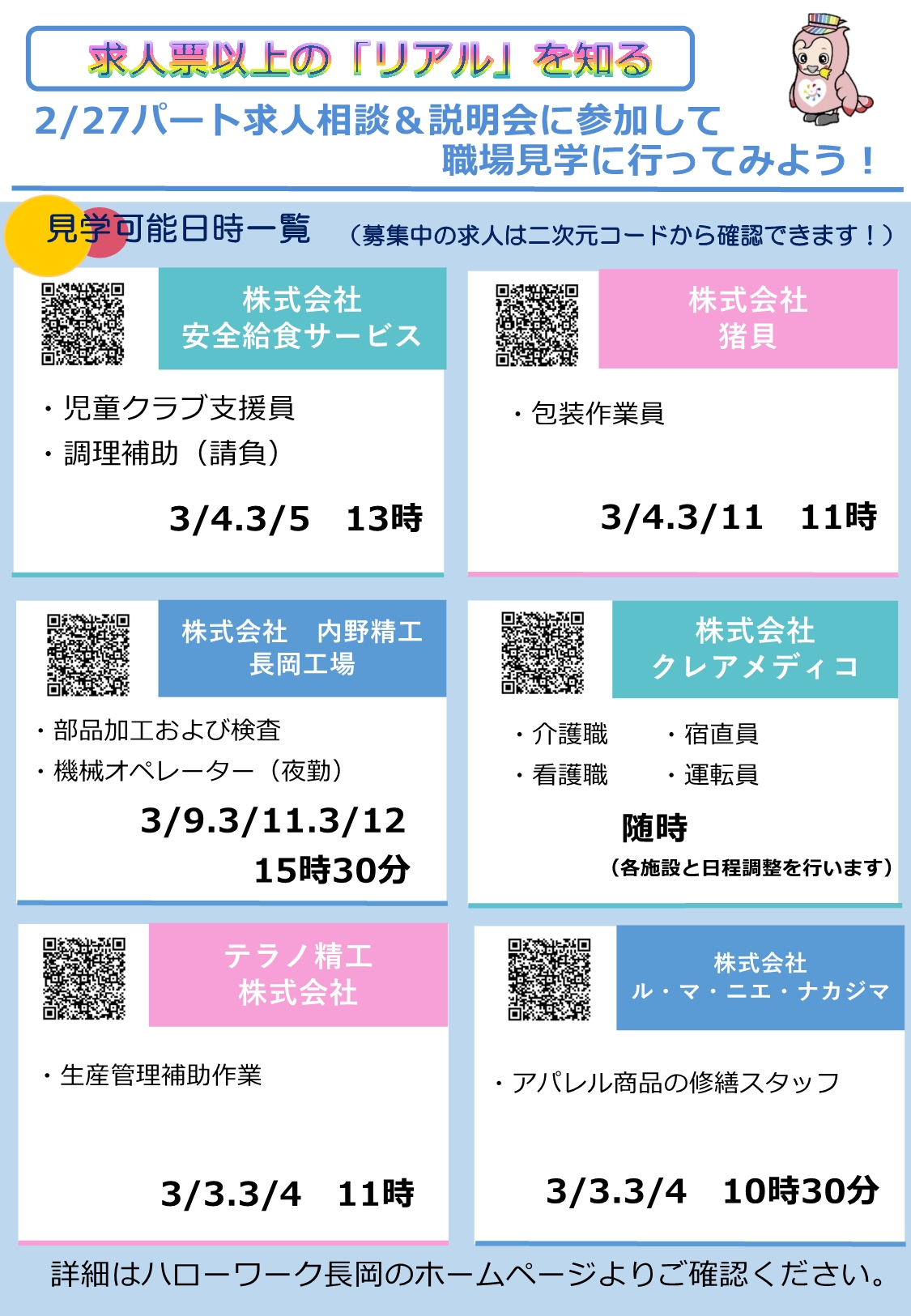2/27(金)パート求人相談&説明会参加企業 職場見学日程一覧