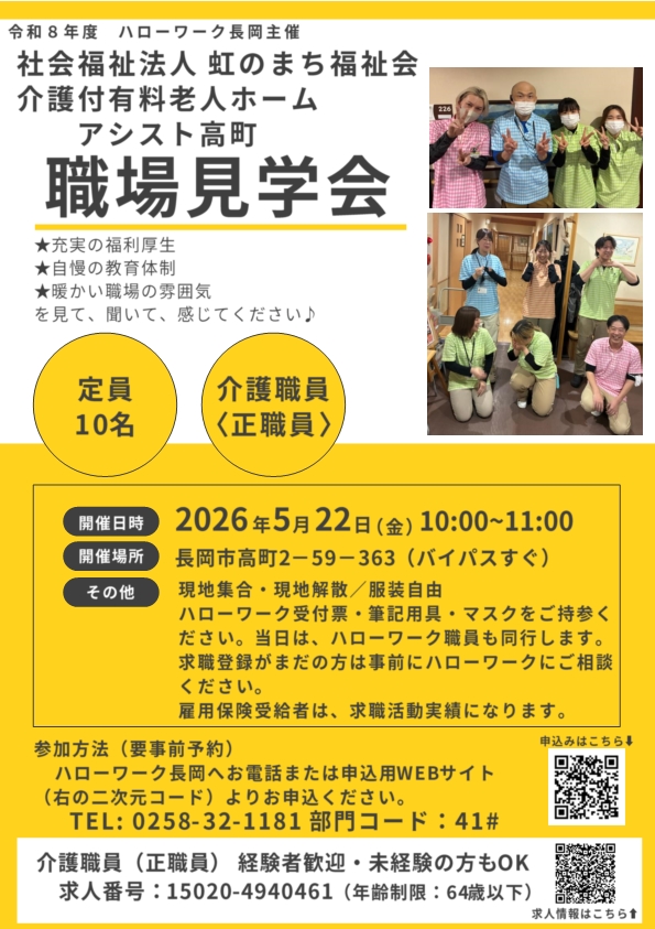 ●見学後に応募を希望される場合は、ハローワークの紹介状が必要となります。ハローワーク窓口までお申し出ください。